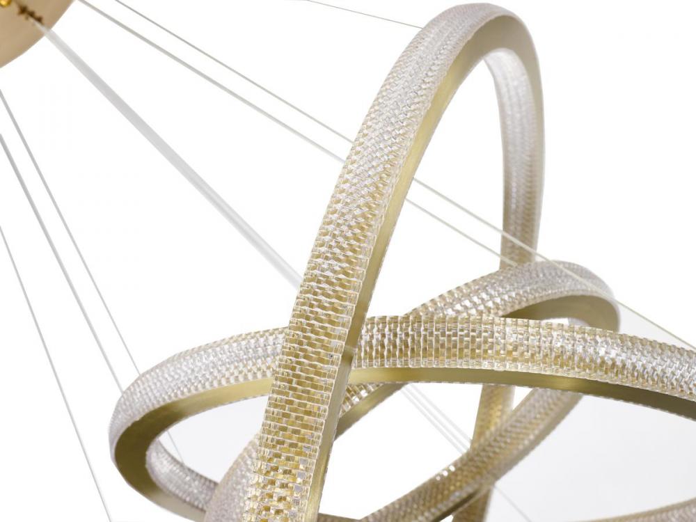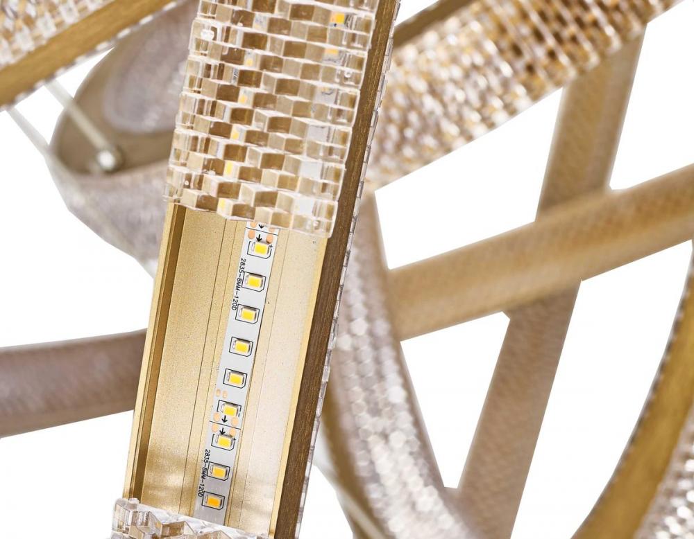 This exquisite LED chandelier is in a sand gold finish. The frame is made out of metal, and it comes with clear acrylic diffusers. The LED bulbs are integrated into the frame. The adjustable links make this fixture suitable for most ceiling heights.