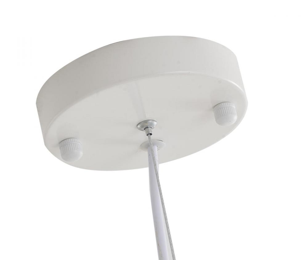 This unique LED chandelier is in a white finish. The frame is made out of metal, and the LED bulb is integrated into the frame. The adjustable cord link makes this fixture suitable for most ceiling heights.