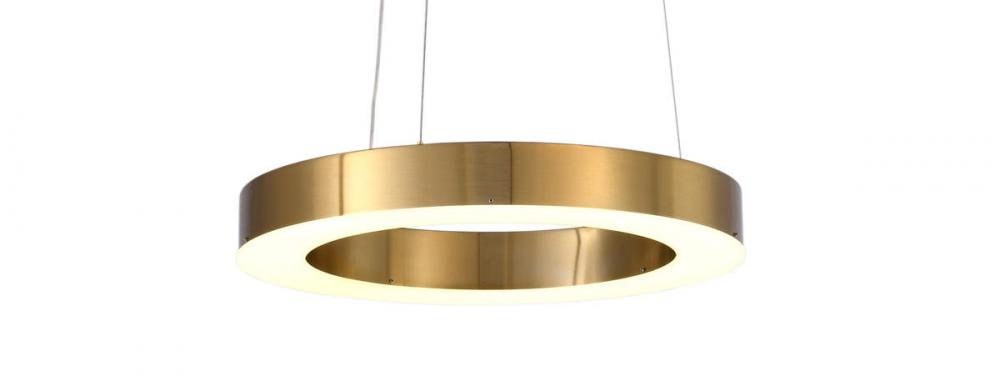 This exquisite LED chandelier is in a gold finish. The frame is made out of metal in a halo ring shape, and the LED bulb is integrated into the frame. The adjustable cord links make this fixture suitable for most ceiling heights.