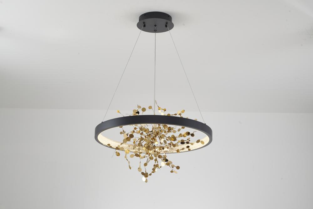 This chandelier is a sand black frame chandelier. It comes with a gold stainless steel confetti interior and a transparent diffuser. This chandelier can change to three LED color temperatures such as 3000K, 4000K and 6000K.