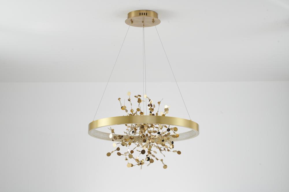 This chandelier is a sand gold frame chandelier. It comes with a gold stainless steel confetti interior and a transparent diffuser. This chandelier can change to three LED color temperatures such as 3000K, 4000K and 6000K.