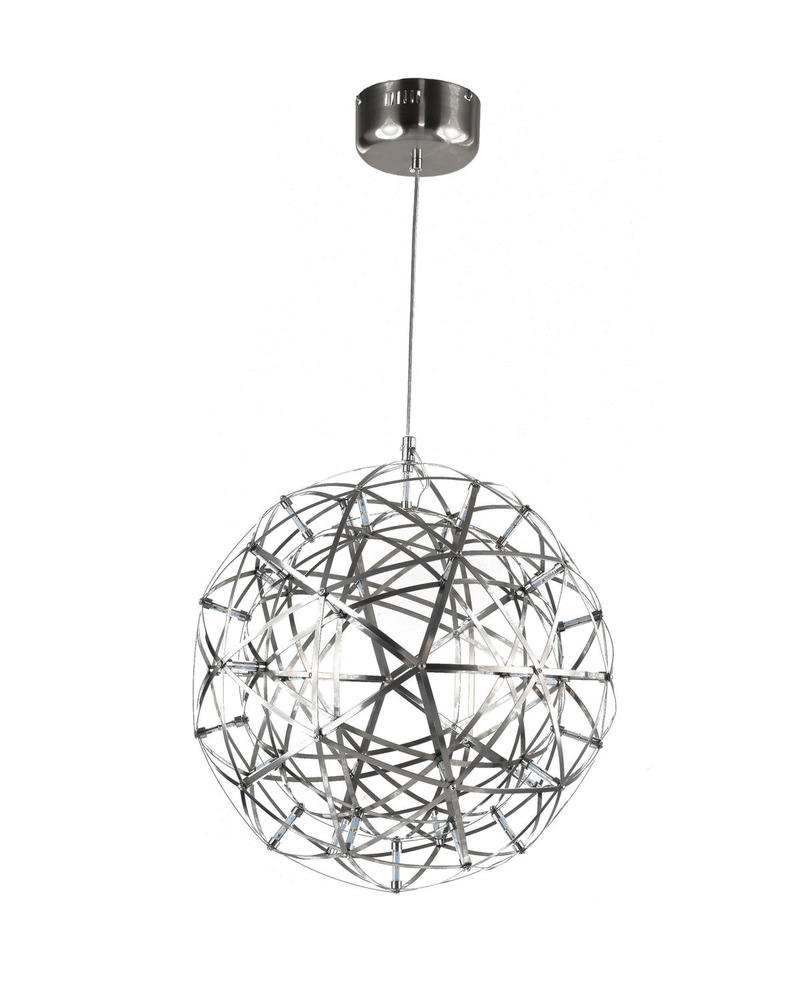 This globe LED lighting fixture is in a satin nickel finish. The frame is made out of stainless steel and there are forty-two LED lights on the frame. This is fixture can be used in any room, entryways and more.