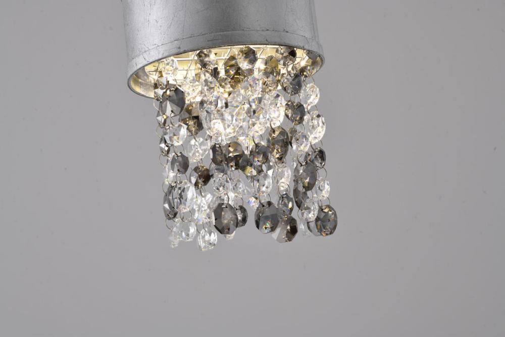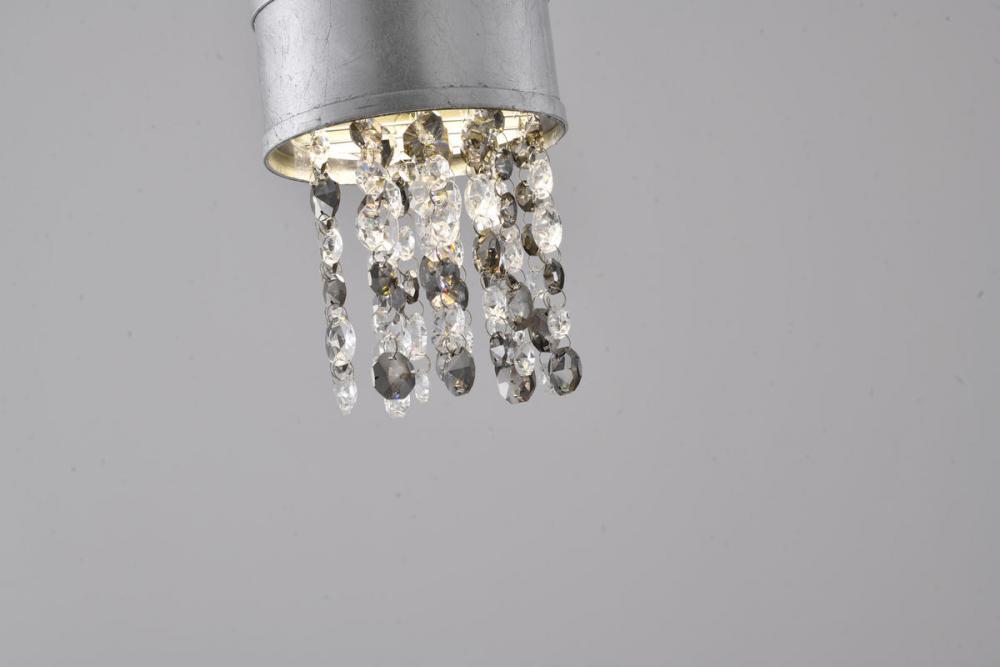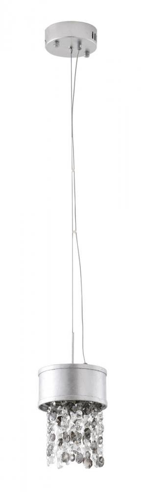 This exquisite LED pendant is in a silver finish. The frame is made out of metal, and the LED bulb is integrated into the frame. It also comes with clear and smoke hanging crystals. The adjustable cord link makes this fixture suitable for most ceiling heights.