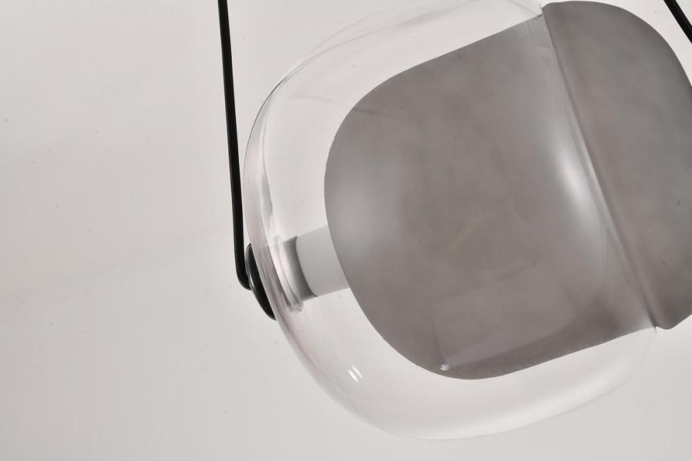 This unique LED pendant is in smoke and clear finish. The frame is made out of glass with black hardware. The LED bulb is integrated into the frame. The adjustable cord links make this fixture suitable for most ceiling heights.