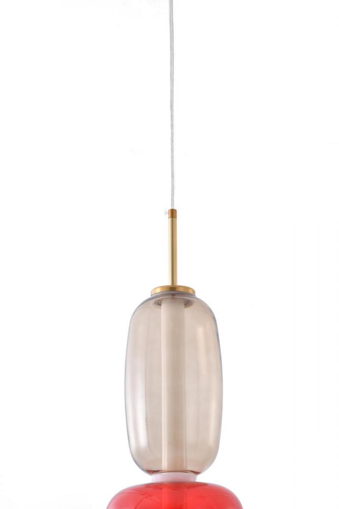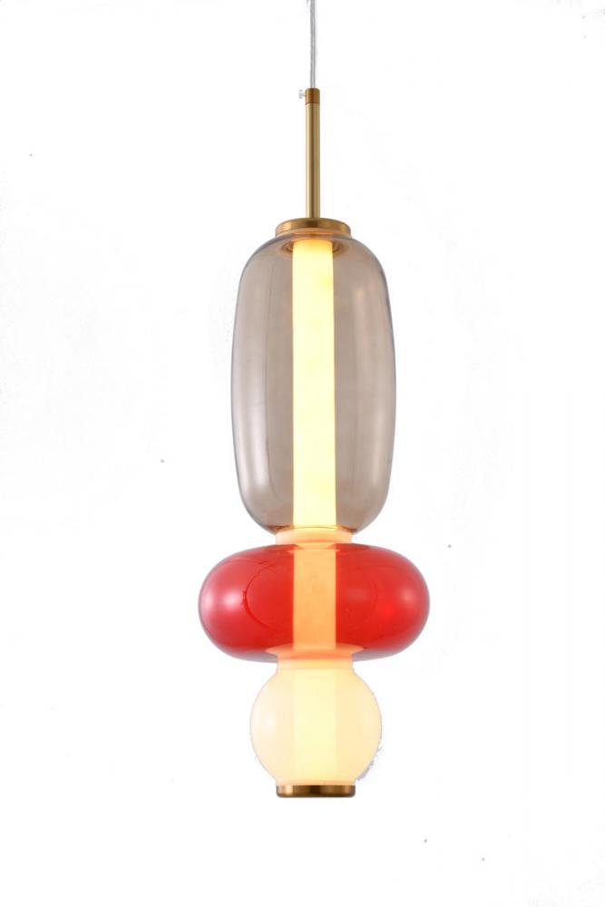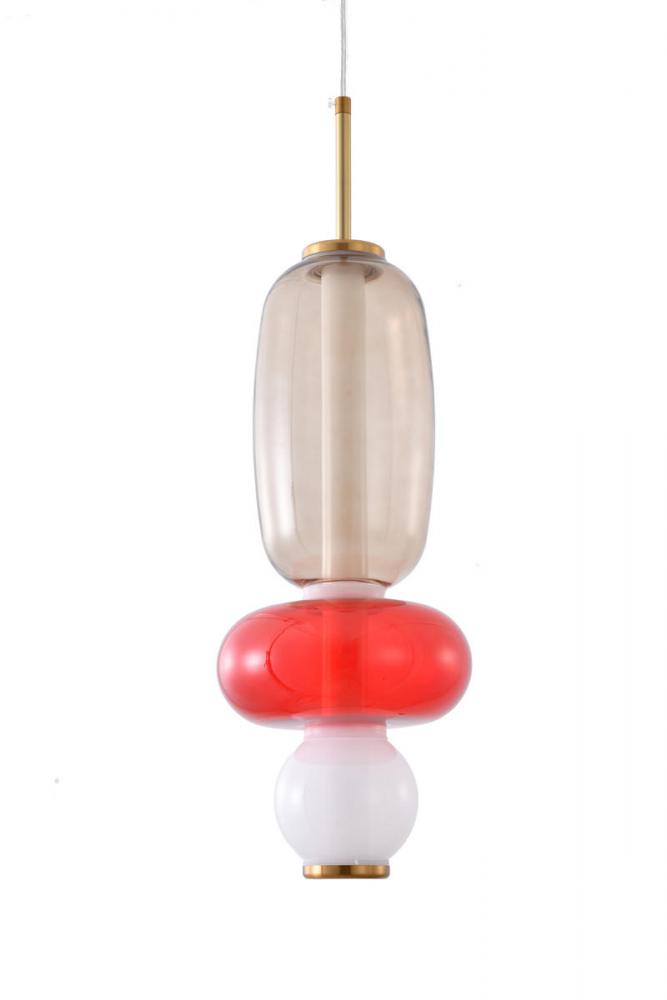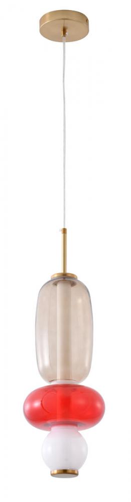 This exquisite LED pendant is in white, grey, and red finish. The frame is made out of metal in gold color, and the LED bulb is integrated into the frame. It also comes with a multi-color glass shade.
