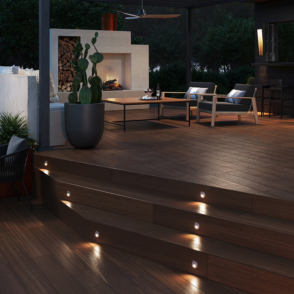 Tilt’s modern integrated LED wall light is available in round or square options with cast 316 stainless steel housing and clear glass to cast a warm glow.