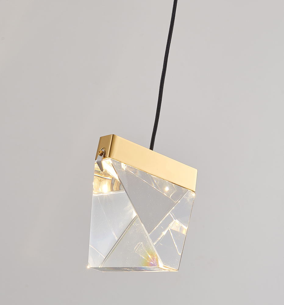 This exquisite LED single pendant lighting is in a brass finish. The frame is made out of iron, and it comes with triangular crystal in clear color. The adjustable cord link makes this fixture suitable for most ceiling heights.
