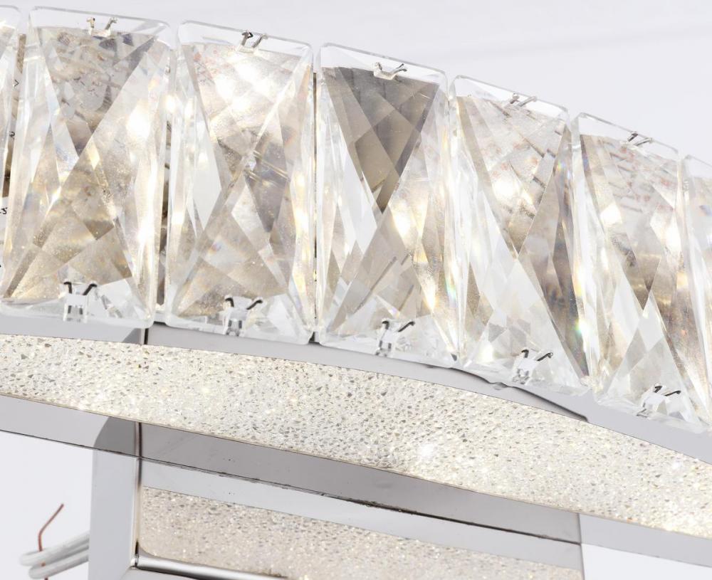 This LED wall sconce is in a chrome finish. The frame is made out of stainless steel with clear crystal band.