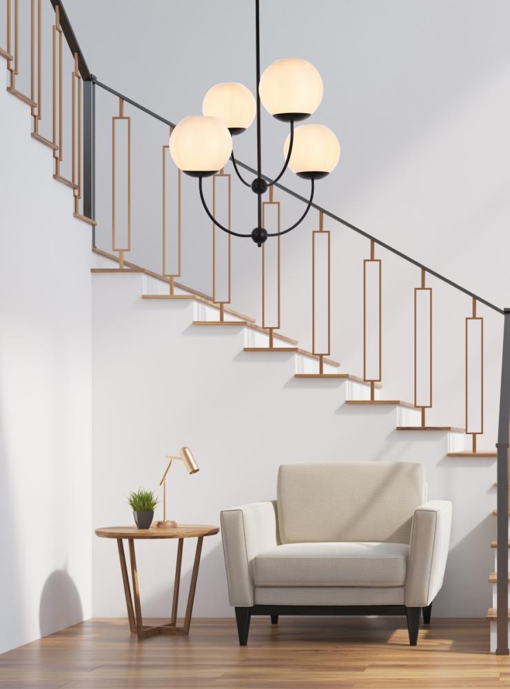 Add major mid-century modern style without taking up any valuable floor space with this 4-light chandelier. It's made from metal and features a slender shaped body that supports four rounded arms running parallel to the downrod. At each end of the arms there is a glass globe shade that diffuses the light from a 40W bulb (not included). This light arrives with an adjustable down rod.
