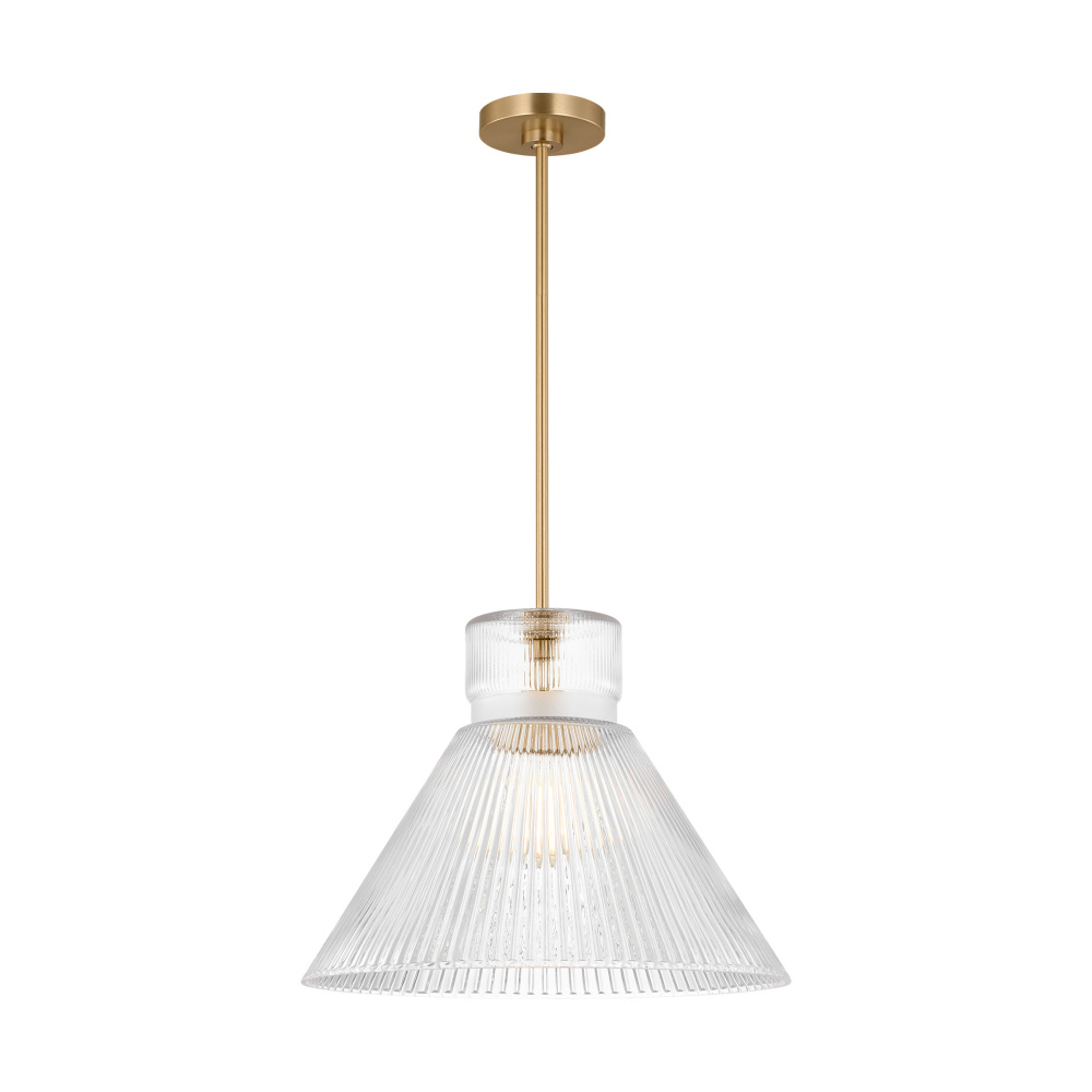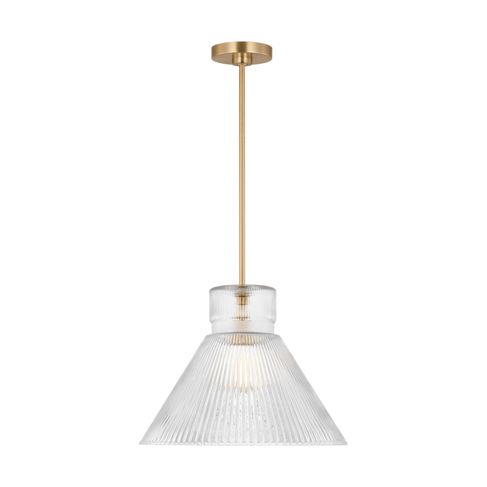 Crafted with Steel in a Satin Brass finish with clear ribbed glass shade