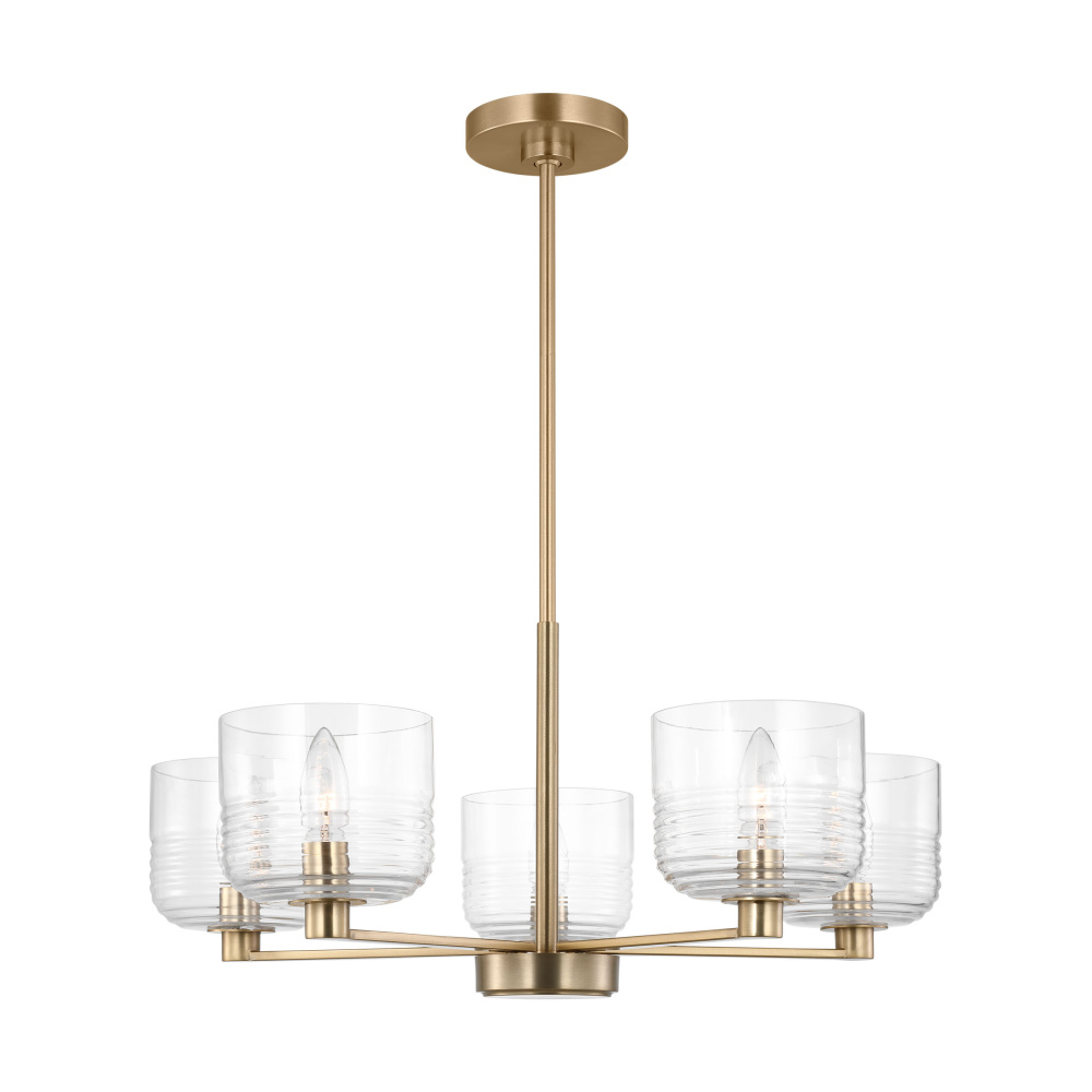 Crafted with Steel in a Satin Brass finish with clear ribbed glass shades
