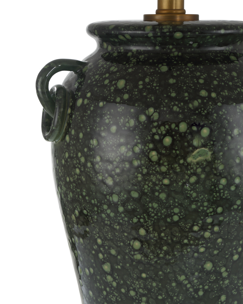 The baluster shape and Ming-Dynasty ornamentations on the Londonderry Green Table Lamp bring it a classic Chinoiserie feel that is echoed by the double-trimmed shade. The porcelain body is a luminous sage green color that reflects its timeless style. An antique brass riser between the optic crystal base and the lamp’s body matches the cap that sits just below the shade. An optic crystal finial complements the base to bring cohesion to the design.