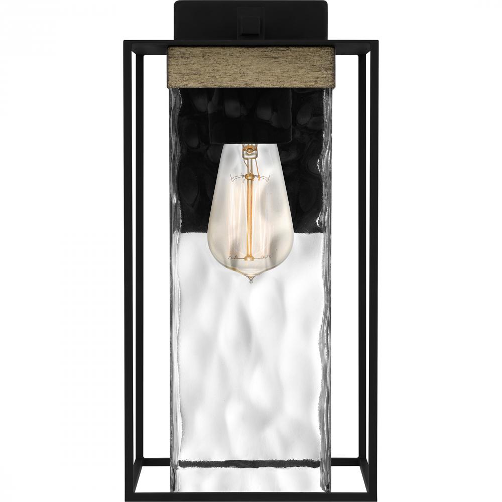 Clear hammered glass adds major visual intrigue in the Longwood lantern collection. This outdoor sconce shines brilliantly with its sturdy rectangular frame, uniquely textured glass shade, and wood accents. A matte black finish completes the look and creat