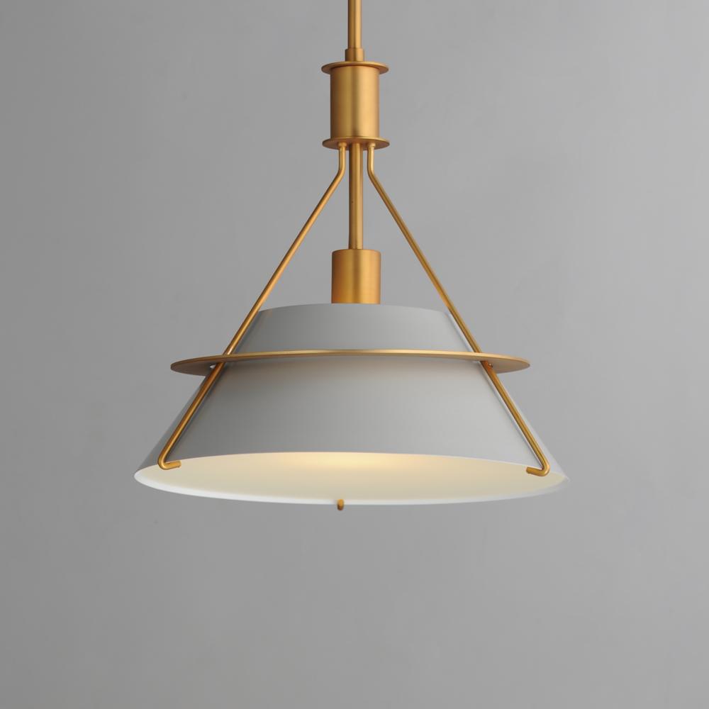 Metal shades of Light French Gray, Black or Matte White are suspended from halos of contrasting Natural Aged Brass finish. Maximizing the light output, the interior of the shades are painted white, and their tops are left open casting light both upwards an