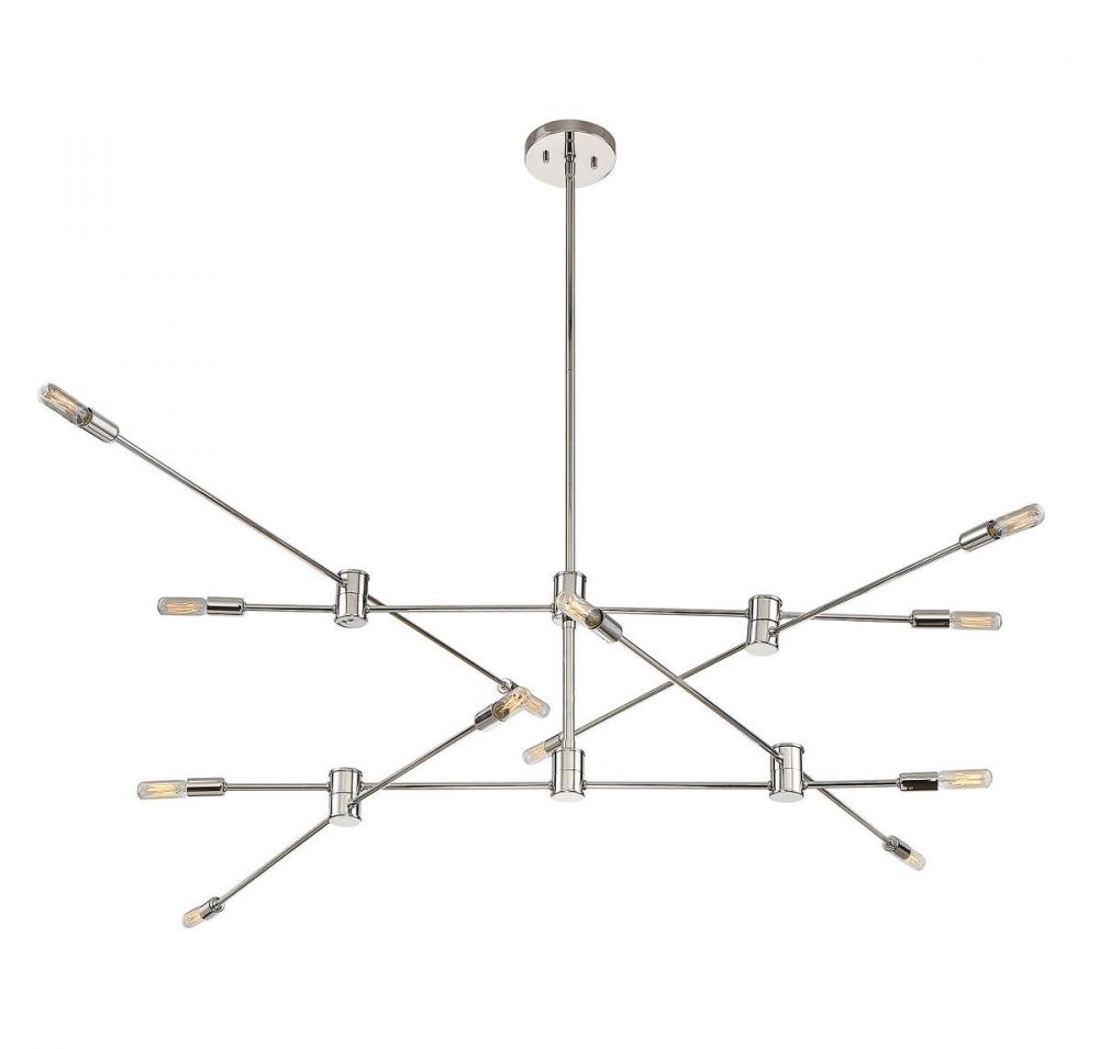 The open, structured look of the Savoy House Lyrique 12-light two-tier chandelier is a great choice for today's stylish interiors. The arms are adjustable, allowing you to create custom looks and change them on the fly. Finished in polished nickel. The hanging height is adjustable and this fixture can be mounted on a sloped ceiling. Chandeliers can be used in a wide variety of spaces, including but certainly not limited to dining rooms, living rooms, great rooms, bedrooms, kitchens, foyers, offices and even bathrooms! Bulbs not included. Try using stylized bulbs such as tubular shape for a different look! The polished nickel finish can be matched with nickel hardware or mixed with hardware in other finishes. Lyrique is perfect for contemporary style spaces and any room that has an edgy touch. When you choose a Savoy House lighting fixture, you can be certain you’ve selected a piece that will withstand the test of time.