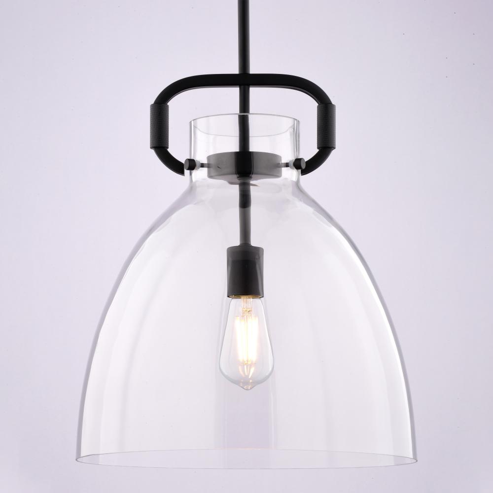 Add a touch of modern industrial style to your kitchen island or dining nook with the Madrona pendant. Its clear glass bell-shaped shade and industrial ring top with knurled metal accents create a unique and eye-catching statement. The black finish adds warmth and sophistication, elevating your home's style without breaking the bank.