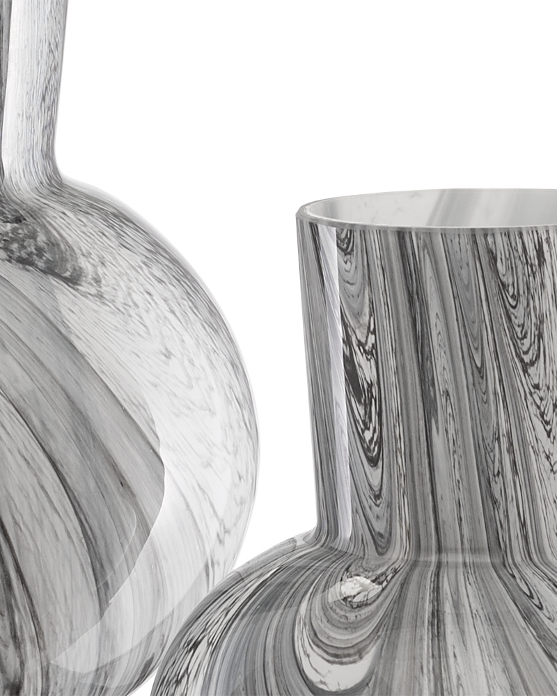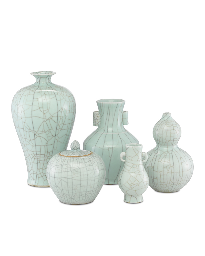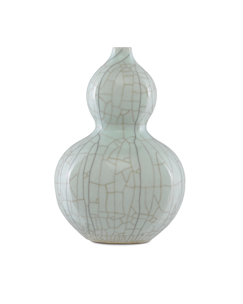 The hand-thrown porcelain body of the Maiping Double Gourd Vase covered with a celadon crackle glaze has been baked and given a light thermic shock to create the crackled lines in the texture. Some lines on the pale green vase are darkened with real tea leaves while others are covered with black calligraphy ink to create depth in the porcelain.