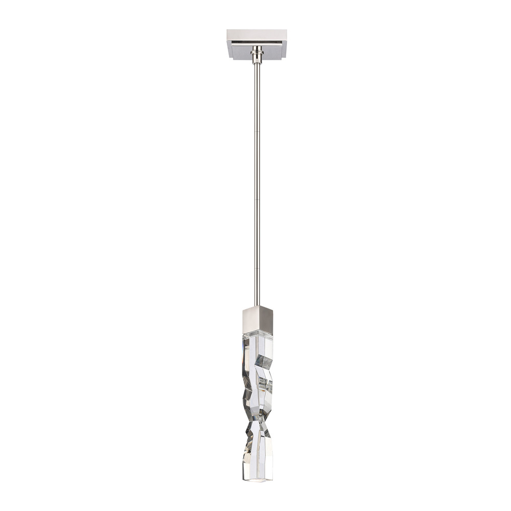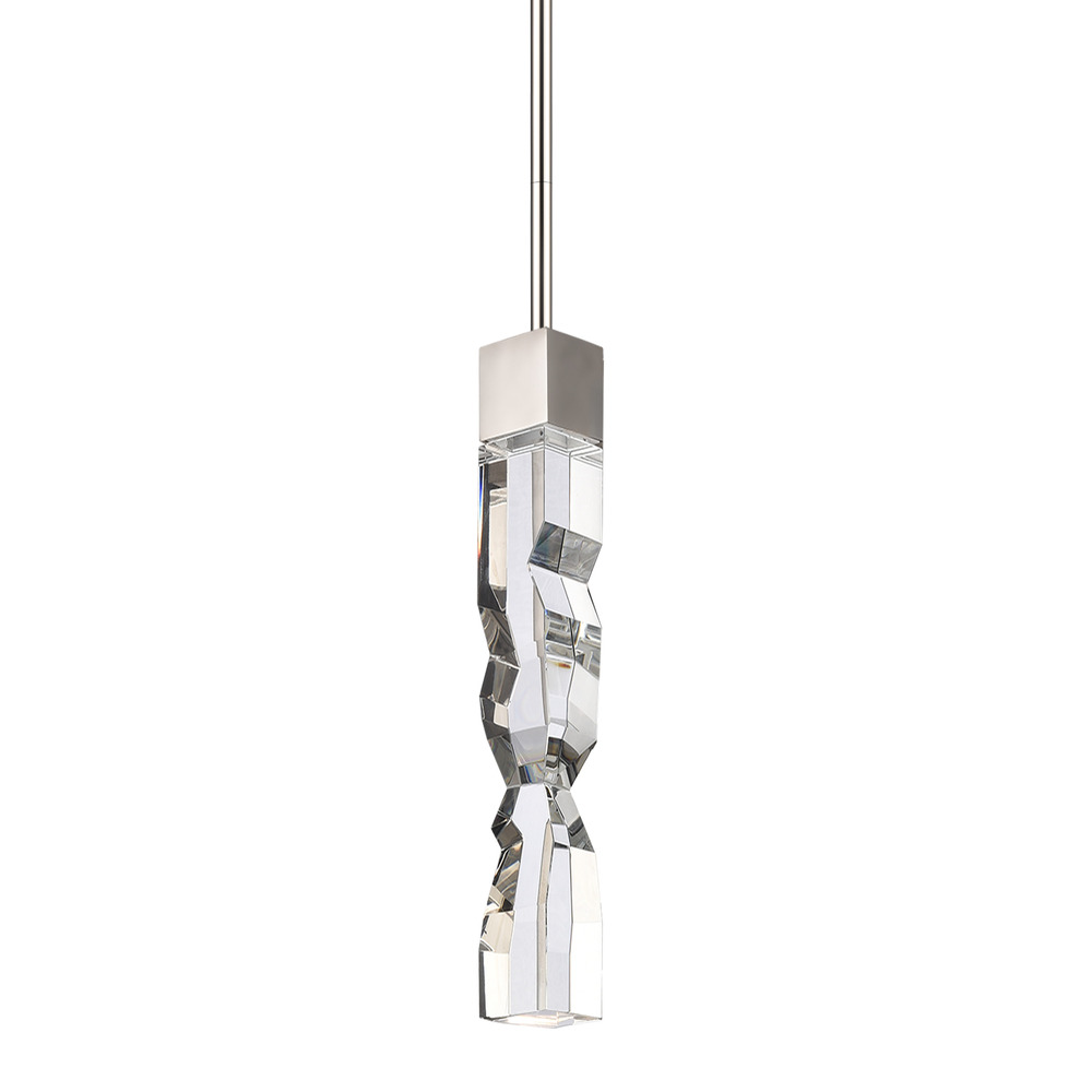 LED hand formed and polished heavy gauge 2" x 2" crystal Mini-Pendant, with deep edges and slants with each side unique. Refined iron metal details with our luxurious polished nickel finish. Integrated Replaceable LED with 3CCT 3000K, 3500K and 4000K.