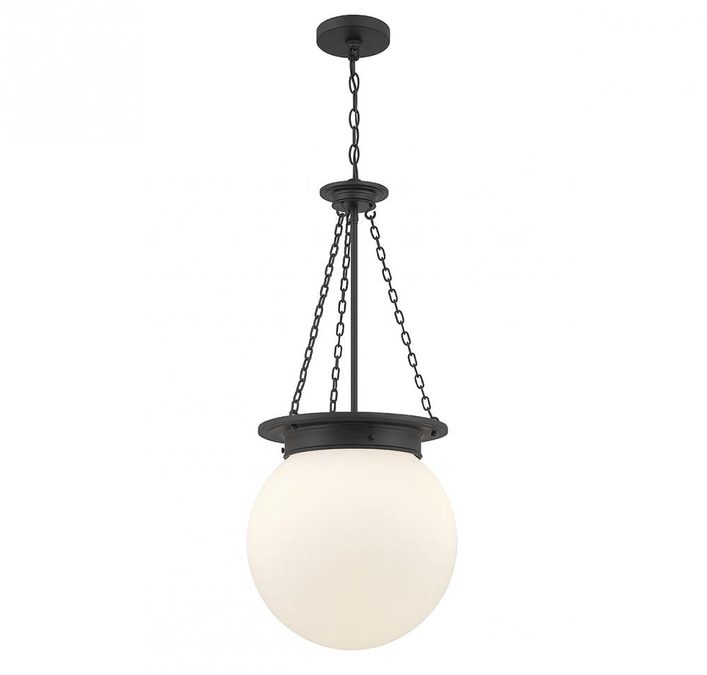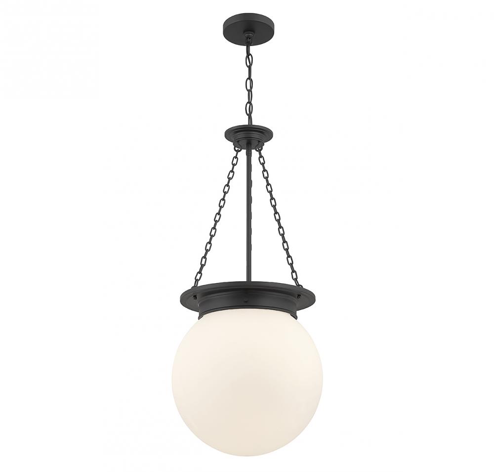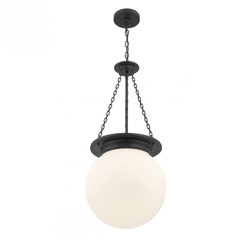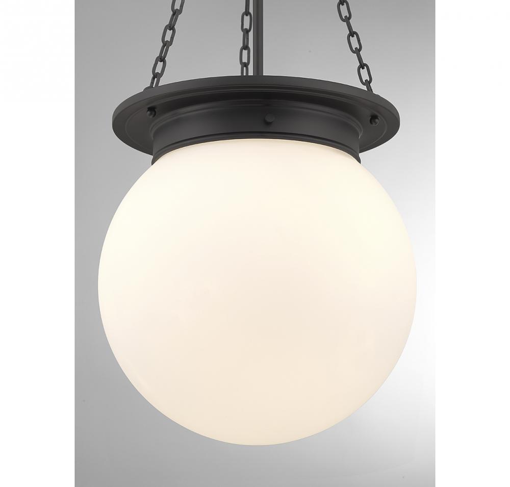 The Savoy House Manor 3-light pendant proves that a classic style can be stunning! An orb-shaped shade of white opal glass hangs down from an understated structure with timeless details. Finished in matte black. Manor is 31” in height and 13.5” in width. It uses 3 candelabra size bulbs of up to 60 watts per bulb (bulbs not included).