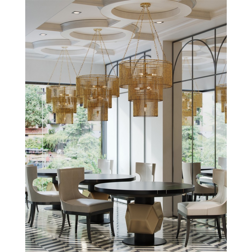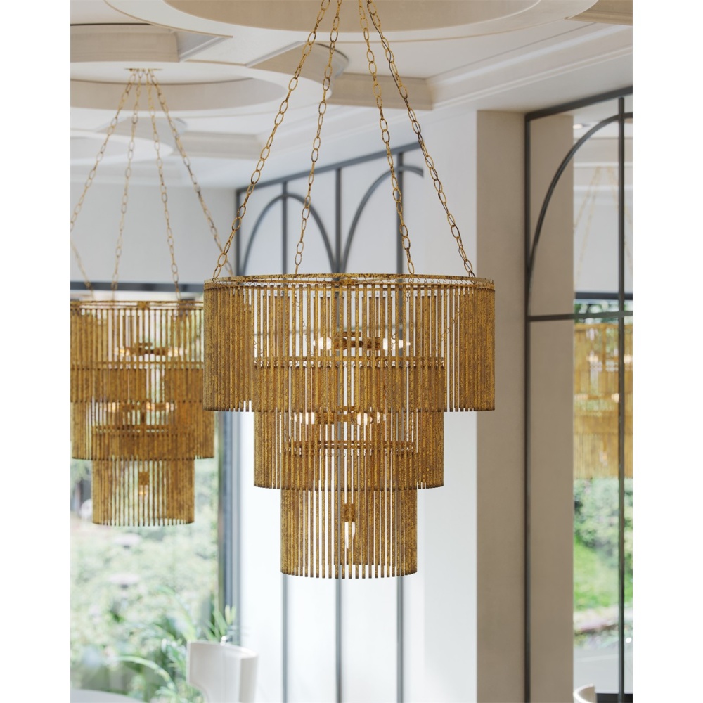 The Mantra Chandelier is an elegant example of mid-century modern luxe. The gold leaf finish on the long tentacles of metal that dangle from its three tiers bring the fixture a powerful punch of patina. This is due to the distressing our finish artisans achieved with this gold chandelier. Adjustable from 51.5" to 106" with use of included chain/rod kit/cable. If your space calls for a longer drop, additional chain/rods/cable is available for purchase.