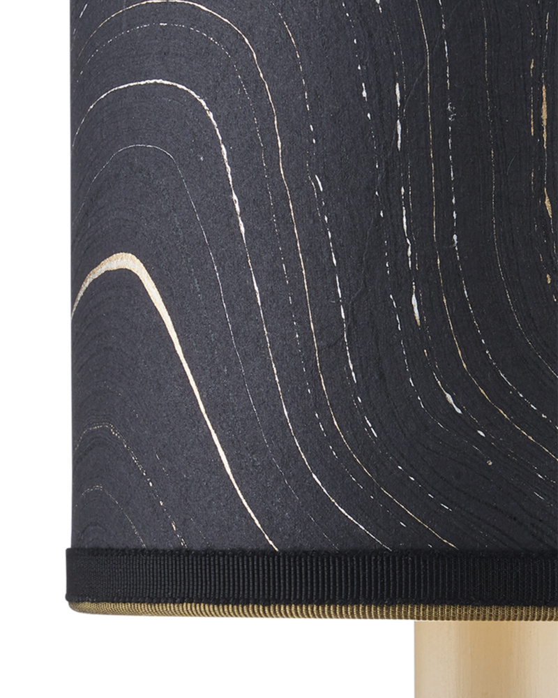 Petite shades are an easy way to bring added style to a space while also introducing color and texture, particularly when they are made from artisanal marbleized paper and ornamented with two layers of grosgrain ribbon in different hues. The saturation of the colors on the handmade tapered and cylindrical shades for chandeliers and wall sconces is achieved by a New England atelier. Patterns will vary because they are created during a very organic process that makes any surface treated to marbleizing so special. There are both vivid and pastel patterns in this collection, as you can see from this black, gold, and silver version of the drum shade. Top Diameter: 5" Bottom Diameter: 5" Height: 5"