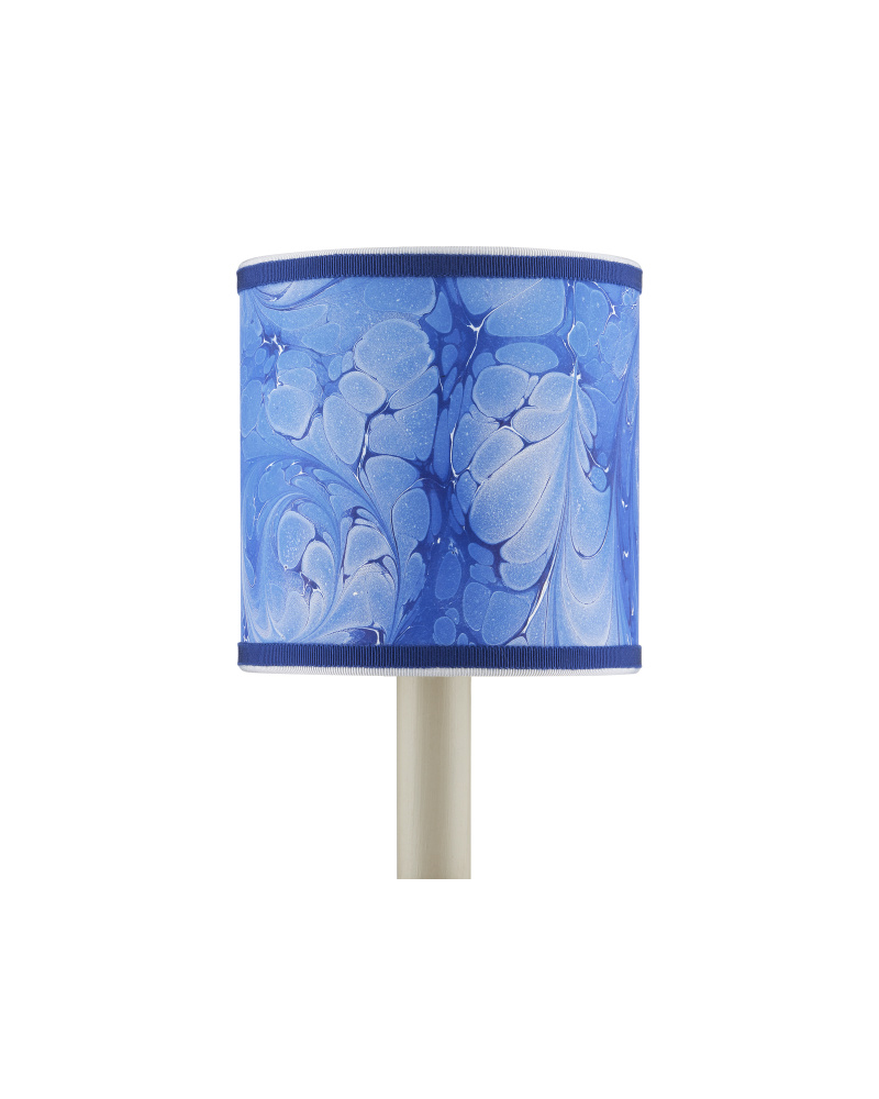 Petite shades are an easy way to bring added style to a space while also introducing color and texture, particularly when they are made from artisanal marbleized paper and ornamented with two layers of grosgrain ribbon in different hues. The saturation of the colors on the handmade tapered and cylindrical shades for chandeliers and wall sconces is achieved by a New England atelier. Patterns will vary because they are created during a very organic process that makes any surface treated to marbleizing so special. There are both vivid and pastel patterns in this collection, as you can see from this swirling bright blue version of the drum shade. Top Diameter: 5" Bottom Diameter: 5" Height: 5"