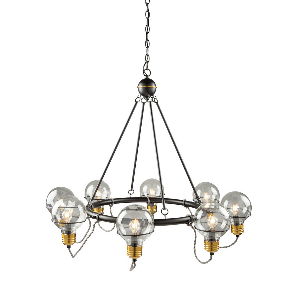 The "Martina Collection" is so unique from a design stance. The glass is actually shaped as a bulb and the bottom glass holder is designed like the bottom of a vintage screw type bulb. The wiring has a "vintage" element since it is twisted the way Thomas Edison first introduced the bulb. The metal work is black while the glass holder is brass. The large chandelier model is shown; there are many matching units available.