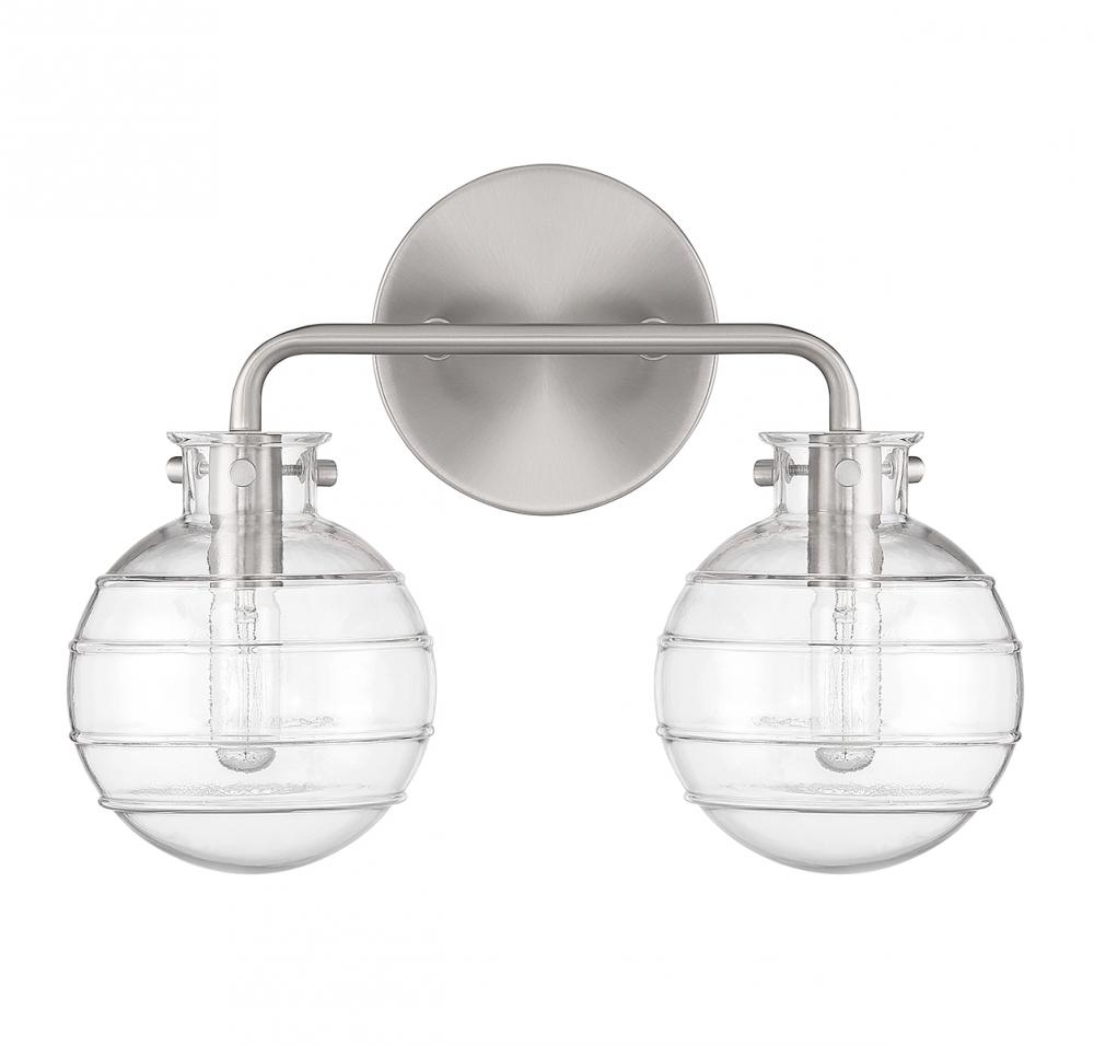 Create a textural, intriguing look with the Savoy House Mason 2-light bath vanity light. Clear swirl glass orbs take center stage in a streamlined design that has a satin nickel finish. Mason is 10" in height, 13.5" in width and extends 6.25" from the wall. It uses two candelabra size bulbs of up to 60 watts per bulb (bulbs not included).