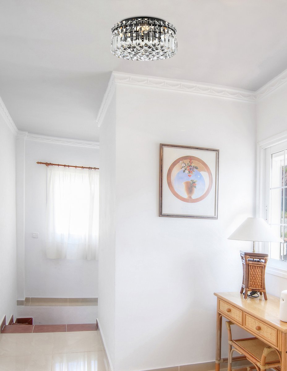 A riot of shapes and textures, Maxime collection flush mounts sparkle in a mosaic of crystal tiles. Square and rectangular precision-cut crystals form the flamboyant exterior while faceted crystal balls create a bubbled effect for light to shine through beneath. Available in a black or chrome finish with clear crystals, these lamps are a luxurious addition to a kitchen, stairwell, foyer, or living room.