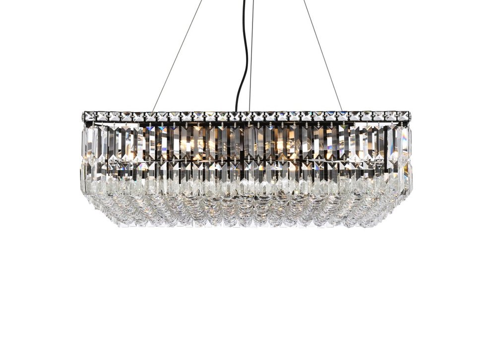A riot of shapes and textures, Maxime collection hanging fixtures sparkle in a mosaic of crystal tiles. Square and rectangular precision-cut crystals form the flamboyant exterior while faceted crystal balls create a bubbled effect for light to shine through beneath. A mischievous asymmetrical hanging tube adds a touch of whimsy to this structured design. Available in a black or chrome finish with clear crystals, these lamps are a luxurious addition to a dining room, stairwell, foyer, or living room.