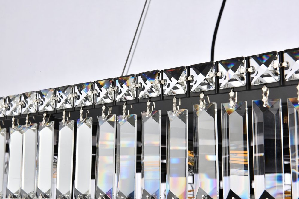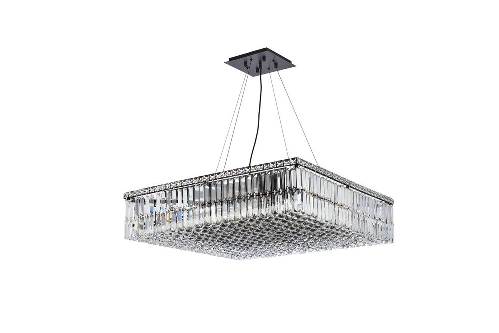 A riot of shapes and textures, Maxime collection hanging fixtures sparkle in a mosaic of crystal tiles. Square and rectangular precision-cut crystals form the flamboyant exterior while faceted crystal balls create a bubbled effect for light to shine through beneath. A mischievous asymmetrical hanging tube adds a touch of whimsy to this structured design. Available in a black or chrome finish with clear crystals, these lamps are a luxurious addition to a dining room, stairwell, foyer, or living room.