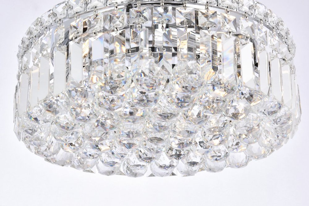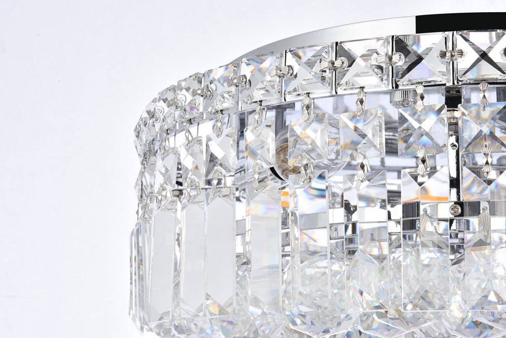 A riot of shapes and textures, Maxime collection flush mounts sparkle in a mosaic of crystal tiles. Square and rectangular precision-cut crystals form the flamboyant exterior while faceted crystal balls create a bubbled effect for light to shine through beneath. Available in a chrome finish with clear crystals, these lamps are a luxurious addition to a kitchen, stairwell, foyer, or living room.
