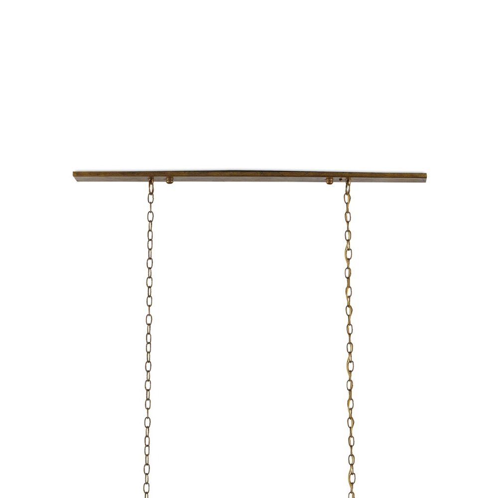 If this gold version of the Maximus Rectangular Chandelier had its very own lyrics, it would be singing, here we go loop de loop. Its wrought iron spirals hold beautiful seeded glass shades that are perfectly on key. The metal on the fixture has a washed gold leaf finish that has been mottled for a slight textural feel. There is also a Maximus with a Pyrite bronze finish.