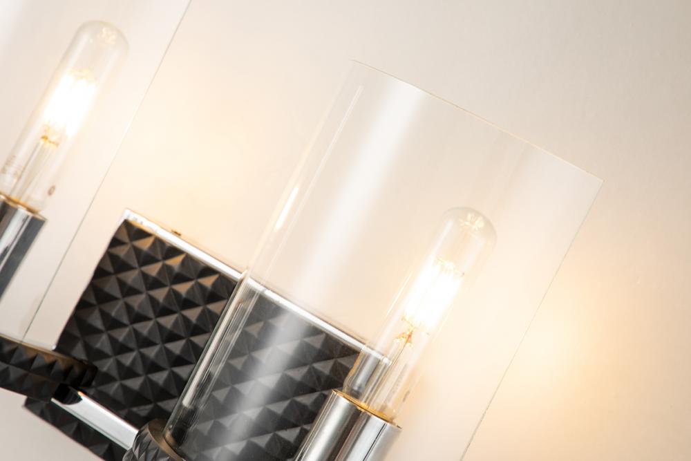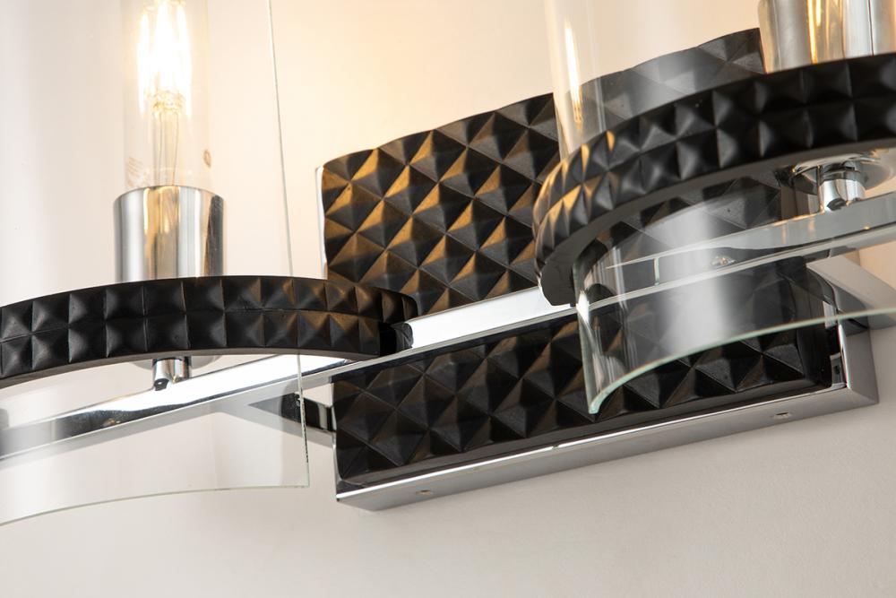 An 18.5" x 10.5" x 7" 2-light vanity in black and chrome with half-drum glass shades. Its textured backplate offers edgy style, ideal over mirrors in any space.