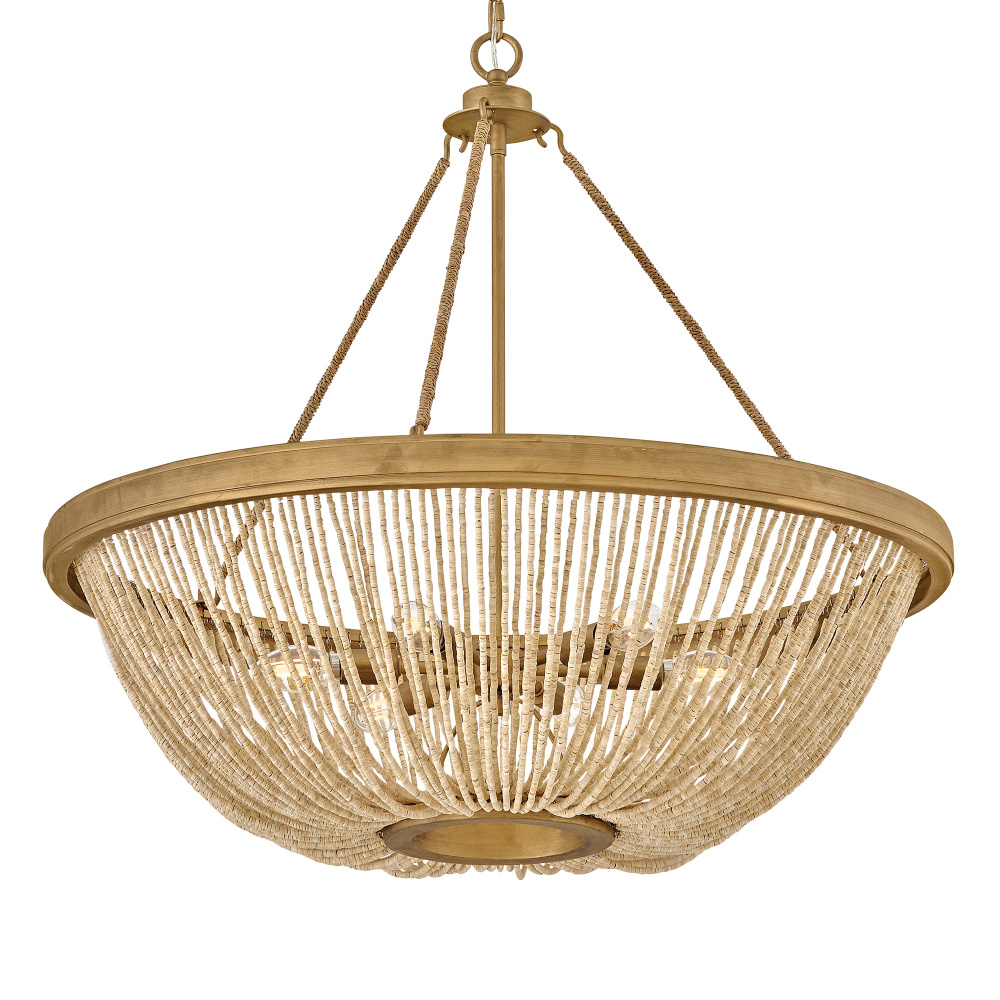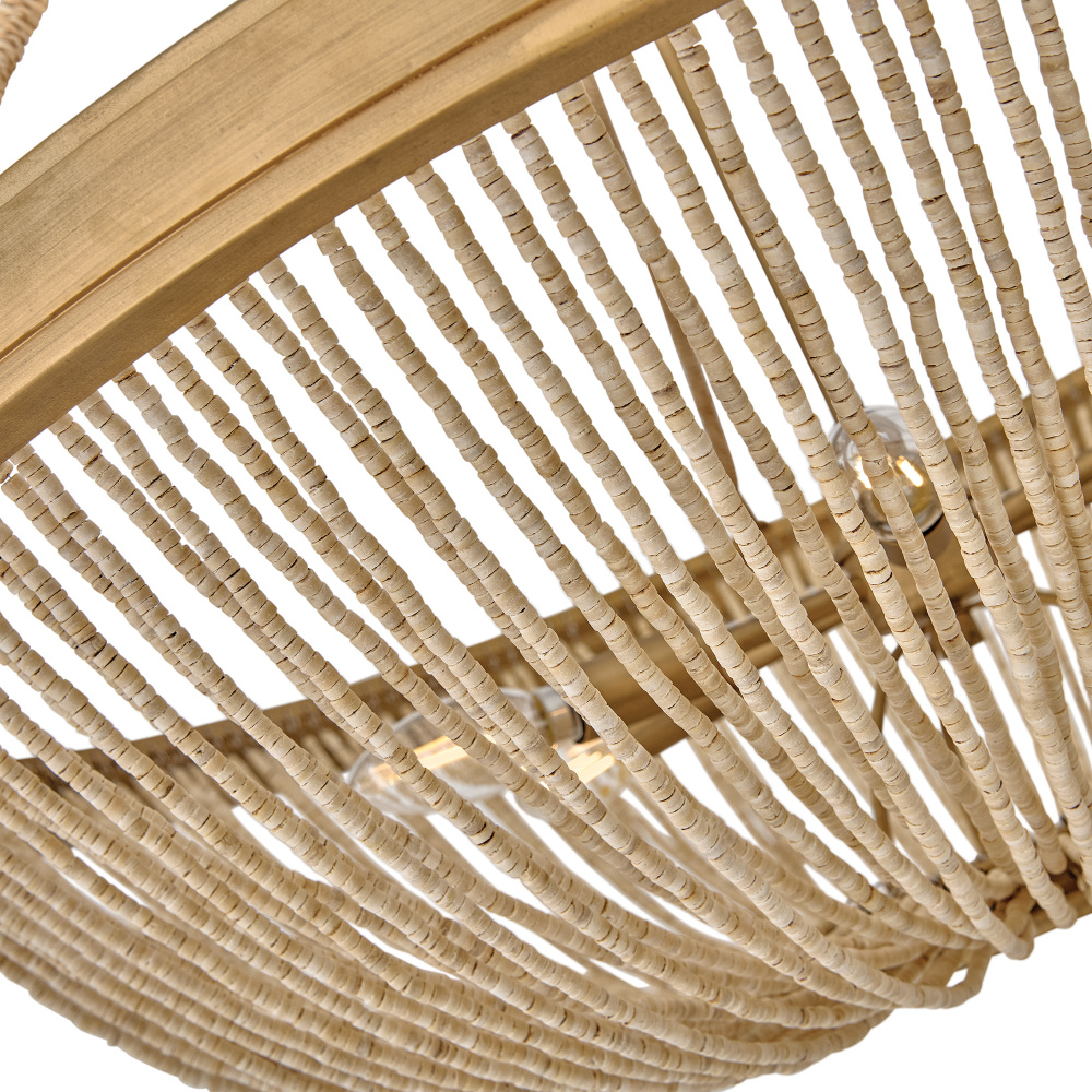 Introduce an element of natural texture and bohemian style to your living space. Tula’s artisan-crafted basket shade is hand-strung with draped strands of coco beads, creating a sheer curtain through which the warm light shines across your room. A hand-painted transitional frame suspended from decorative arms wrapped in natural fiber rope features a Burnished Gold finish with brushed distressed detailing that adds visual depth to the design.