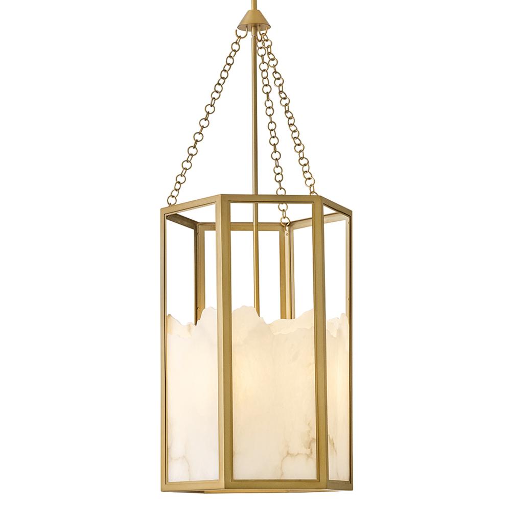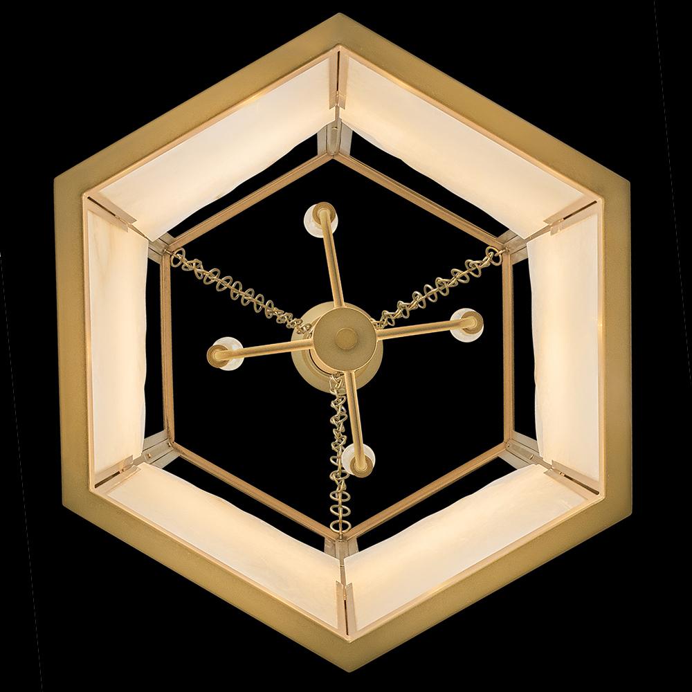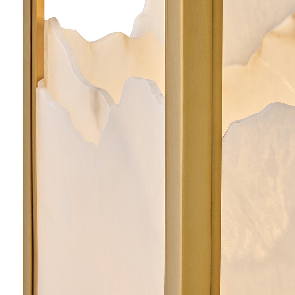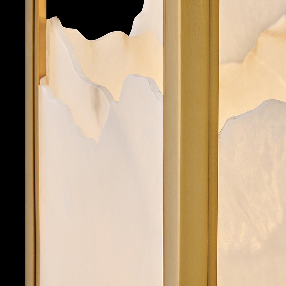 Inspired by Italian design, Valeta’s natural alabaster shade with jagged top edges is showcased by a geometric Lacquered Brass frame. Truly one-of-a-kind graining, color variations, and organically formed textures make each Veleta fixture genuinely unique.