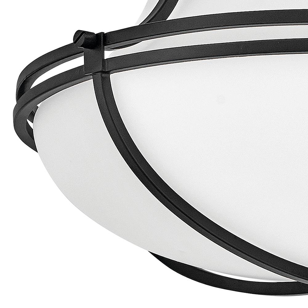 Saddler’s sculptural tear-drop dome forms a chic silhouette accentuated by decorative metal straps. Etched opal glass complemented by a Heritage Brass or Black finish creates a versatile design with high style.