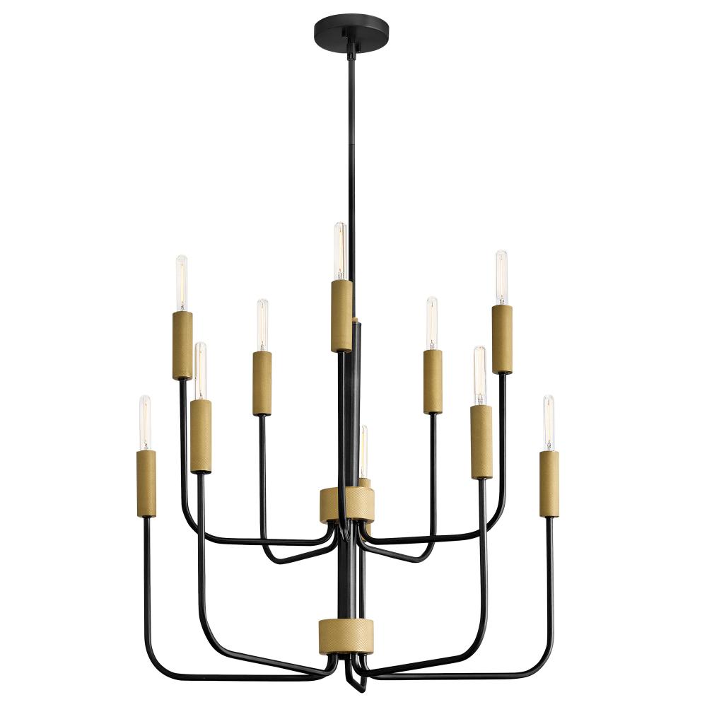 Austen’s slim, exaggerated design creates a chic transitional shape accentuated by knurled candle sleeves and stem details. Black and Lacquered Brass finishes are complemented by exposed bulbs. Experiment with different lamps to find a look that’s perfect for your space.