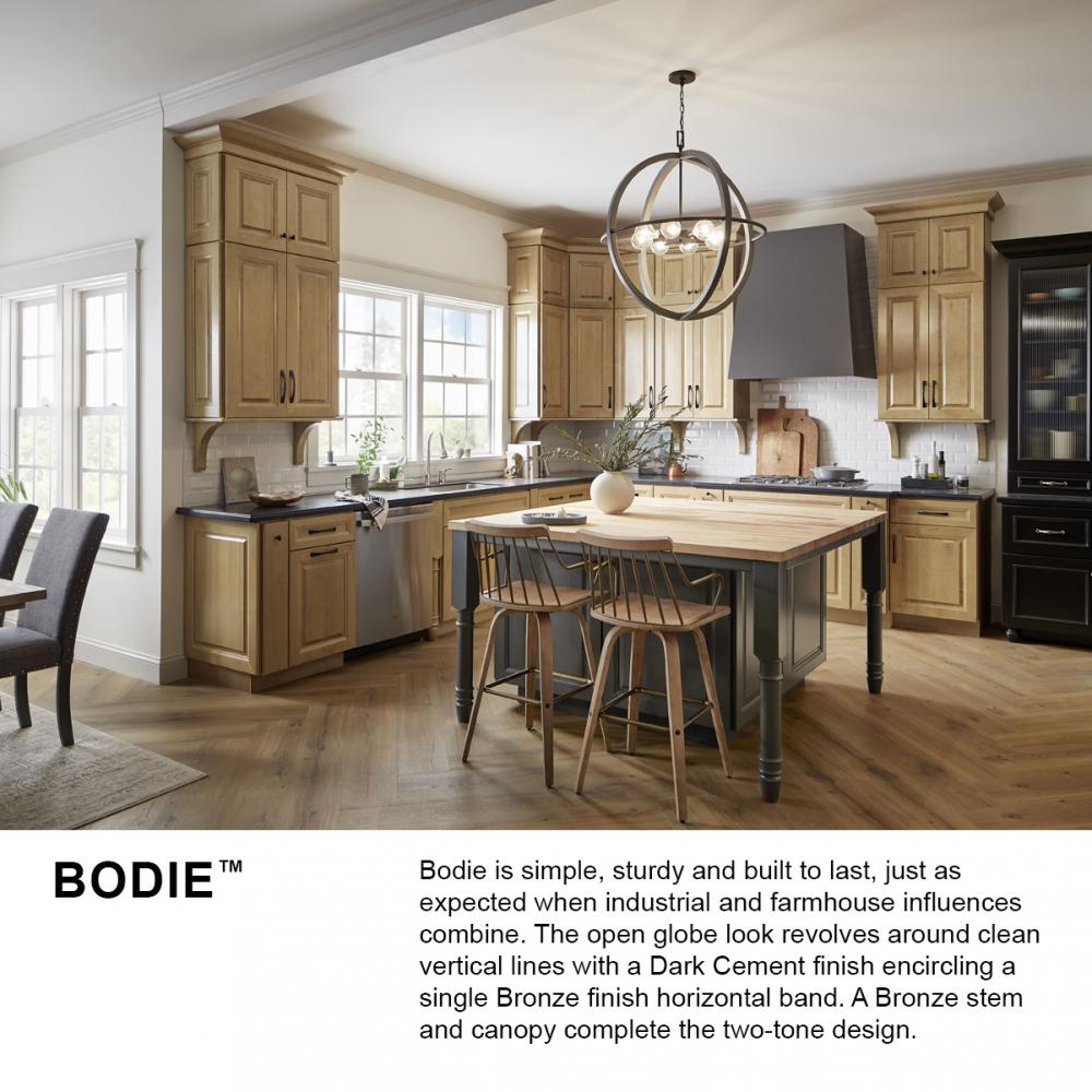 Bodie is simple, sturdy and built to last, just as expected when industrial and farmhouse influences combine. The open globe look revolves around clean vertical lines with a Dark Cement finish encircling a single Bronze finish horizontal band. A Bronze stem and canopy complete the two-tone design.