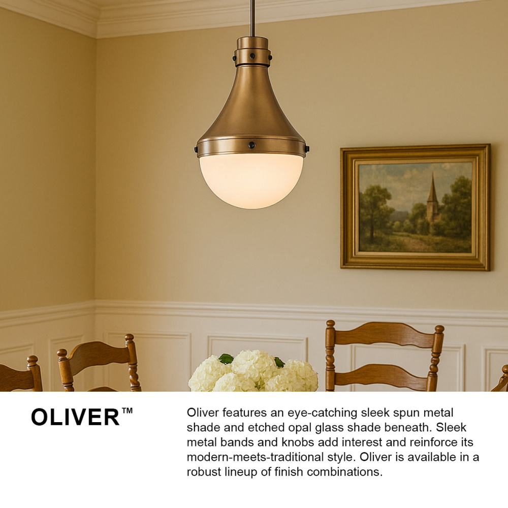 Oliver features an eye-catching sleek spun metal shade and etched opal glass shade beneath. Sleek metal bands and knobs add interest and reinforce its modern-meets-traditional style. Oliver is available in a robust lineup of finish combinations.