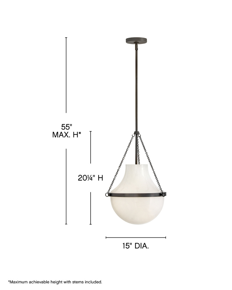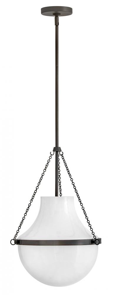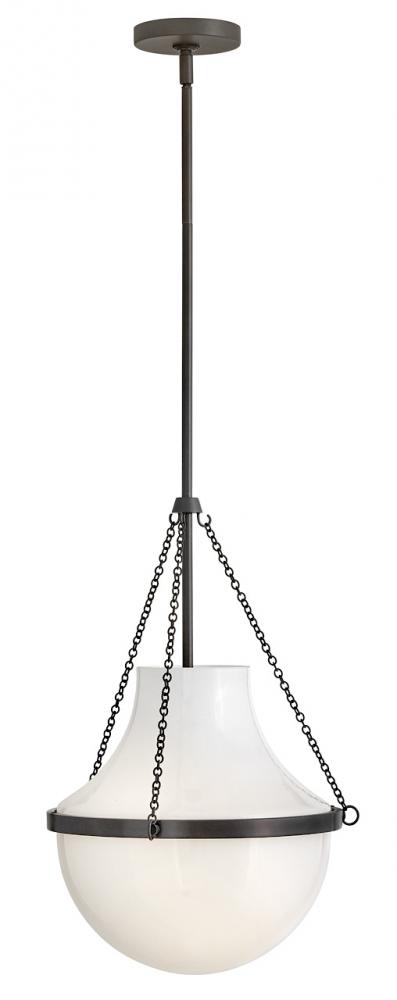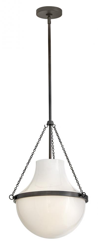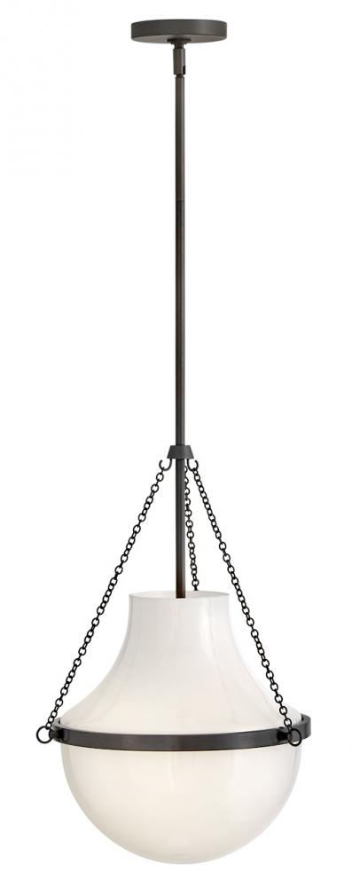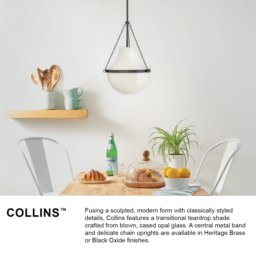 Fusing a sculpted, modern form with classically styled details, Collins features a transitional teardrop shade crafted from blown, cased opal glass. A central metal band and delicate chain uprights are available in Heritage Brass or Black Oxide finishes.