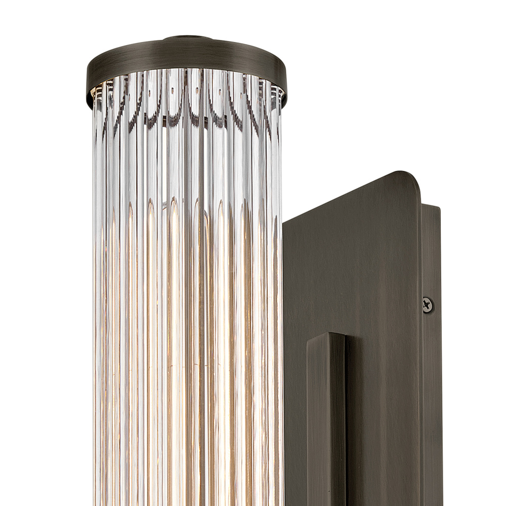 A touch of modern style and vintage charm, Ellery’s Clear glass shade is composed of tall cylindrical glass rods, creating a beautiful reeded effect when illuminated. A large rectangular backplate and matching end caps are finished in a Black Oxide, Heritage Brass, or Polished Nickel finish that complements any bath or living space.