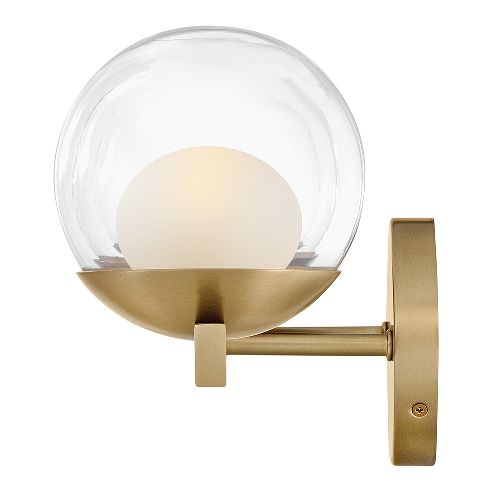 Sophisticated with an ultramodern twist, Sunni’s sleek design showcases a distinctive glass globe that artfully layers a clear glass outside with an etched white interior. A minimal backplate and frame are finished in a bold Black or luxurious Lacquered Brass finish to easily complement your space.