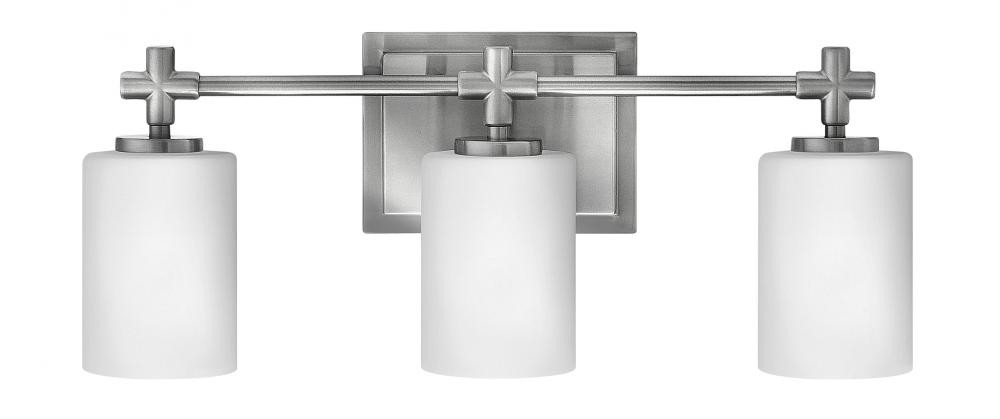 Laurel's appealing form combines both traditional and transitional design elements. Available Brushed Nickel, and features etched opal glass shades and medium base bulbing. Chic details, such as a precision die-cast cross reminiscent of a timeless faucet handle, and a cast stepped backplate, convey a lasting elegance.