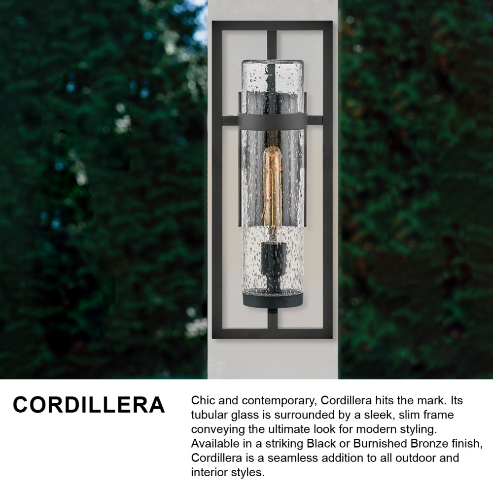 Chic and contemporary, Cordillera hits the mark. Its tubular glass is surrounded by a sleek, slim frame conveying the ultimate look for modern styling. Available in a striking Black or Burnished Bronze finish, Cordillera is a seamless addition to all outdoor and interior styles.