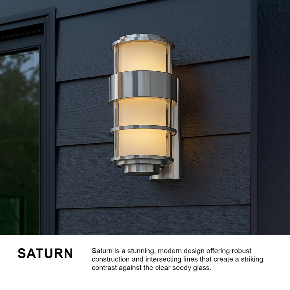 A stunning modern design, Saturn boasts a robust construction accentuated by bold intersecting lines. A chic glass cylinder creates striking contrast against Saturn’s geometric frame, bringing style and dramatic ambiance to any patio or entryway.