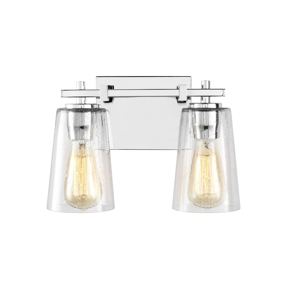 The Sean Lavin Mercer two light vanity fixture in chrome provides abundant light for your bath vanity, while adding a layer of today's style to your interior design. Modern details, like the clean square supports of the cross arm and sleek, rectangular backplate, are defining features of the Mercer. Choose from either refreshingly bright Chrome or warm, rustic Oil Rubbed Bronze hardware for a distinct look, both with tapered Clear Seeded glass shades that complete the tailored look.