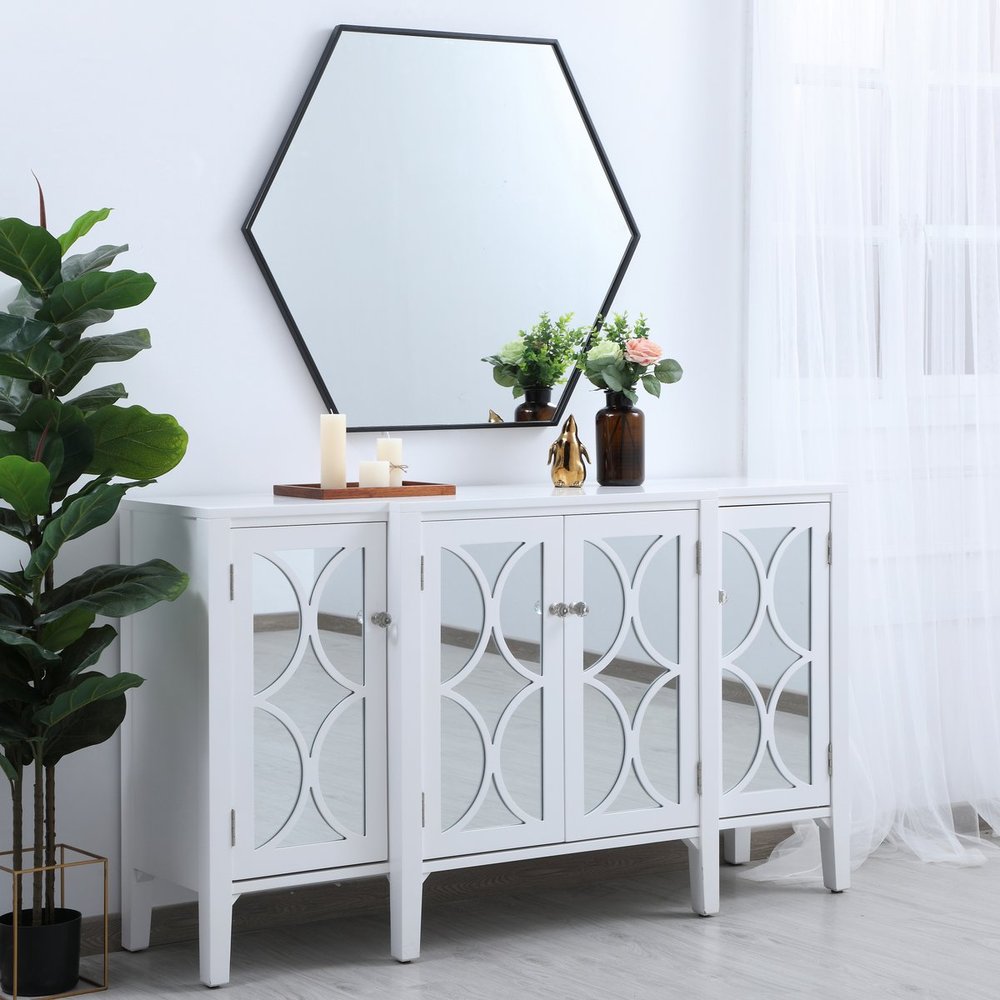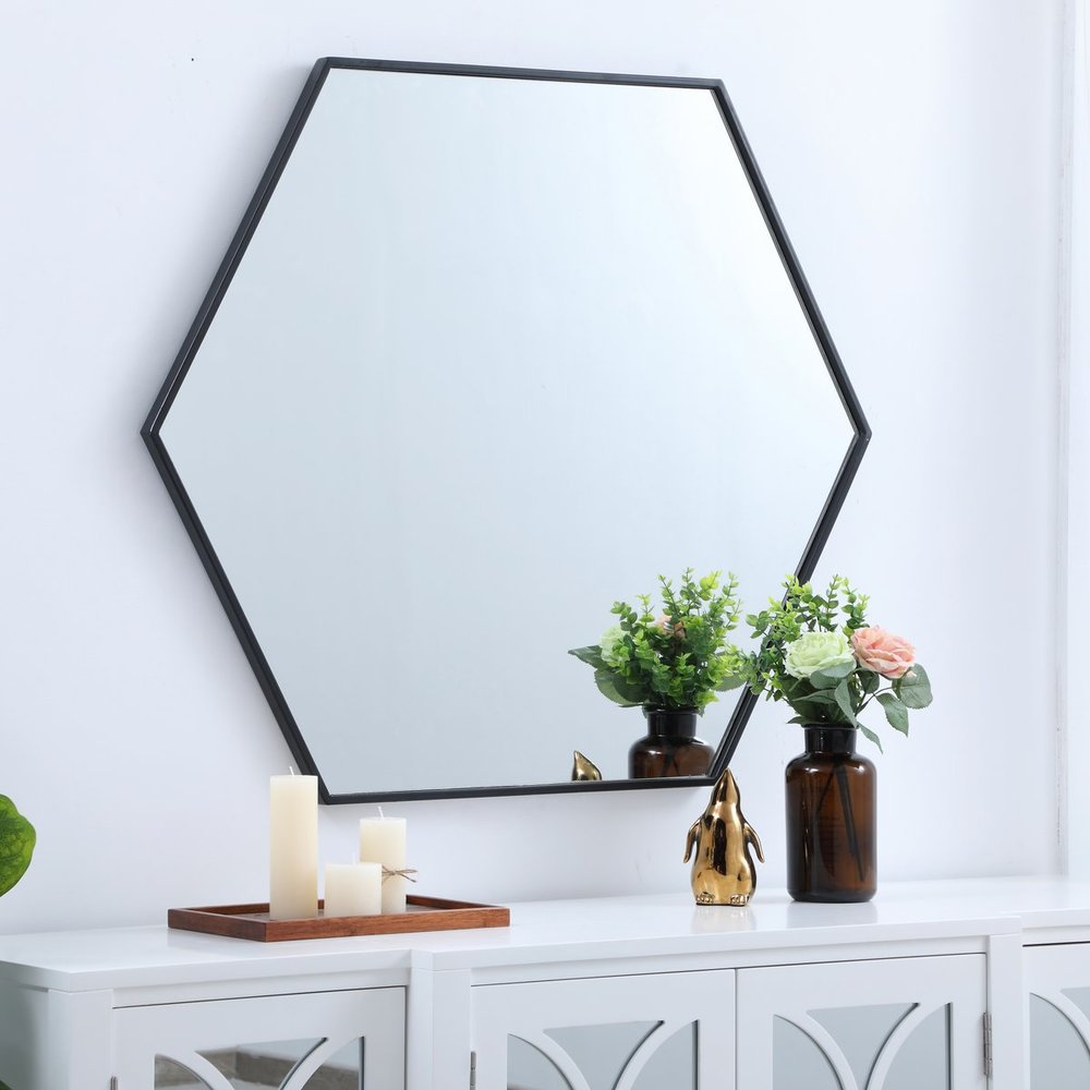 Add a bit of visual fun to your home with this playful hexagonal-shaped mirror. Its stylish personality will mingle with your décor and create a mesmerizing display of contemporary excitement. The clear mirror opens the visual space of your room, while the slender metal frame adds subtle color. Available in a black, brass or Silver finish and comes in a variety of sizes--it's the perfect mirror for any sized home.