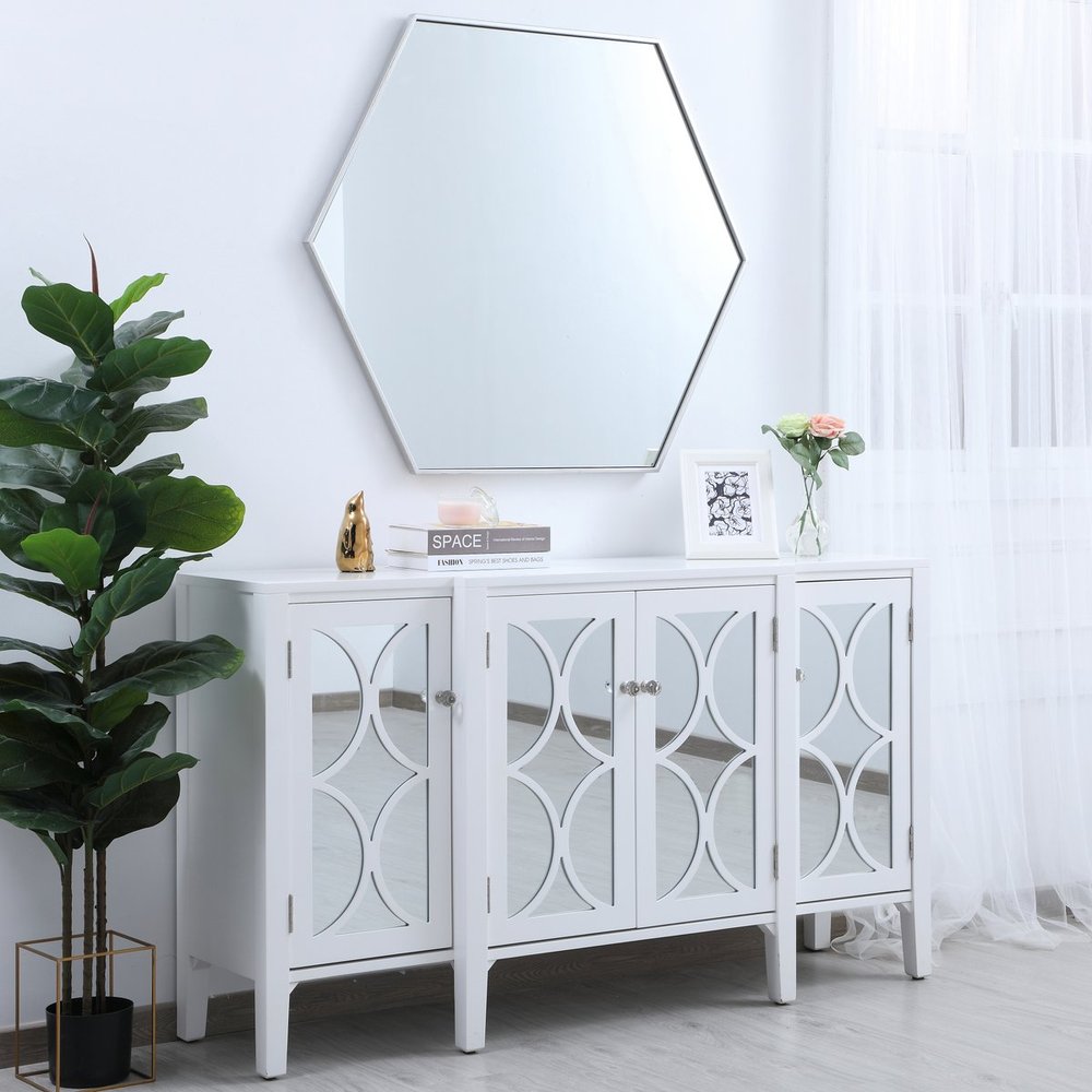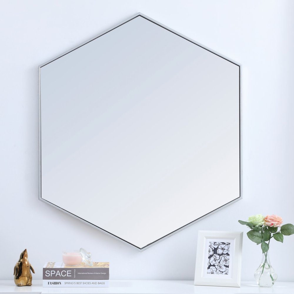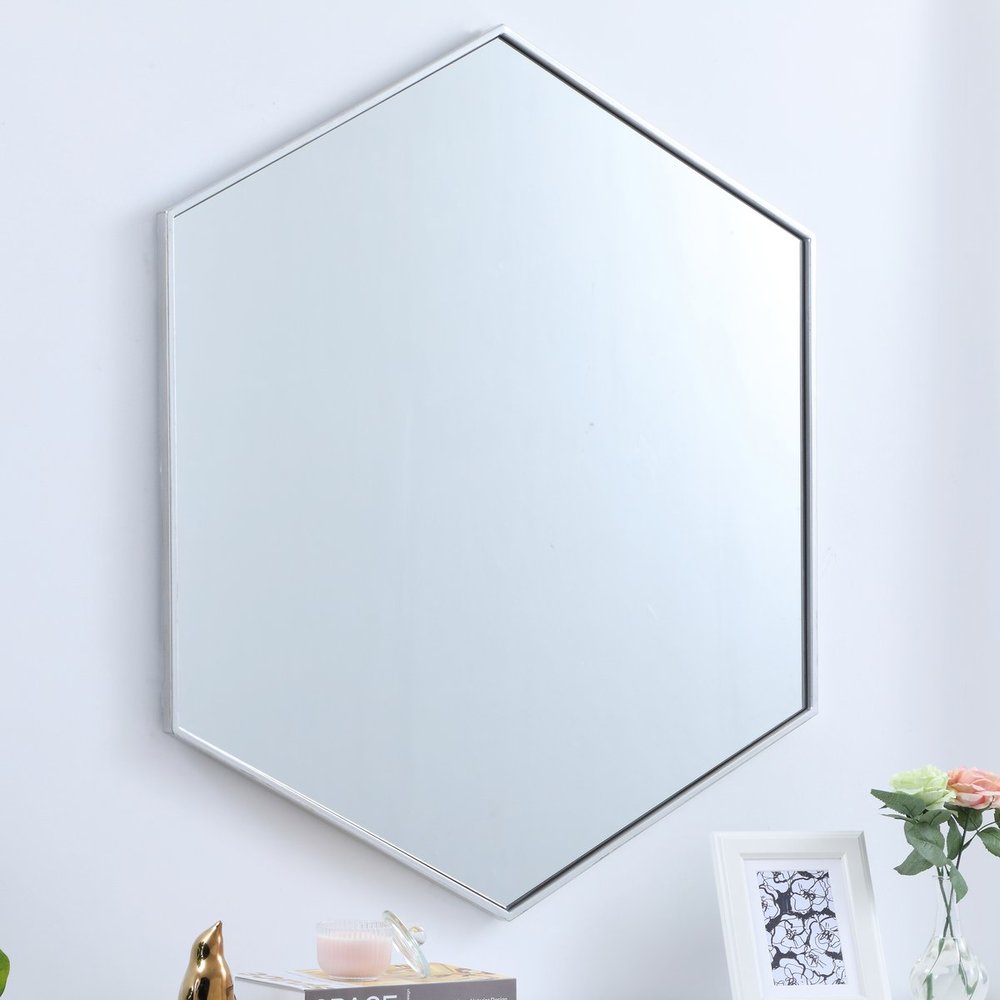 Add a bit of visual fun to your home with this playful hexagonal-shaped mirror. Its stylish personality will mingle with your décor and create a mesmerizing display of contemporary excitement. The clear mirror opens the visual space of your room, while the slender metal frame adds subtle color. Available in a black, brass or Silver finish and comes in a variety of sizes--it's the perfect mirror for any sized home.