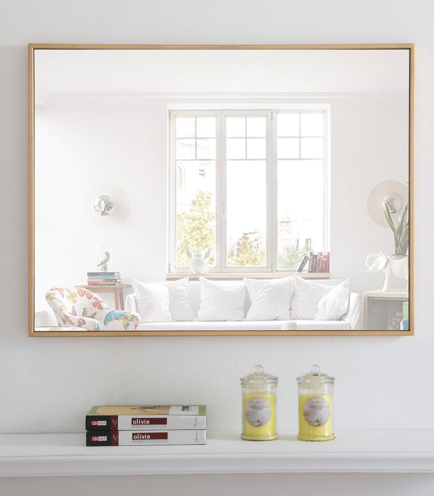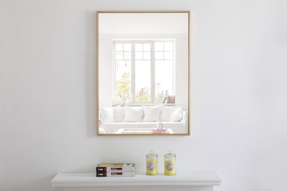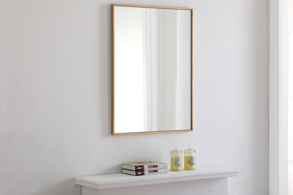 The classic clean and straight lines of this rectangular mirror in brass finish provide you with a timeless and elegant look to accent any room or hallway in your home or office, featuring an ultra-thin metal frame in deep profile, refecting a minimalist's design and industrial styling. To ensure your home safety, we uses metal hanger bar that are securely welded to the back of the metal frame. We recommend using suitable heavy duty picture/mirror hooks, selecting the best type of fixing for the particular wall you wish to hang the mirror on, using the appropriate rawl plug if required. Measurement: 24x32, hang vertical or horizontal.